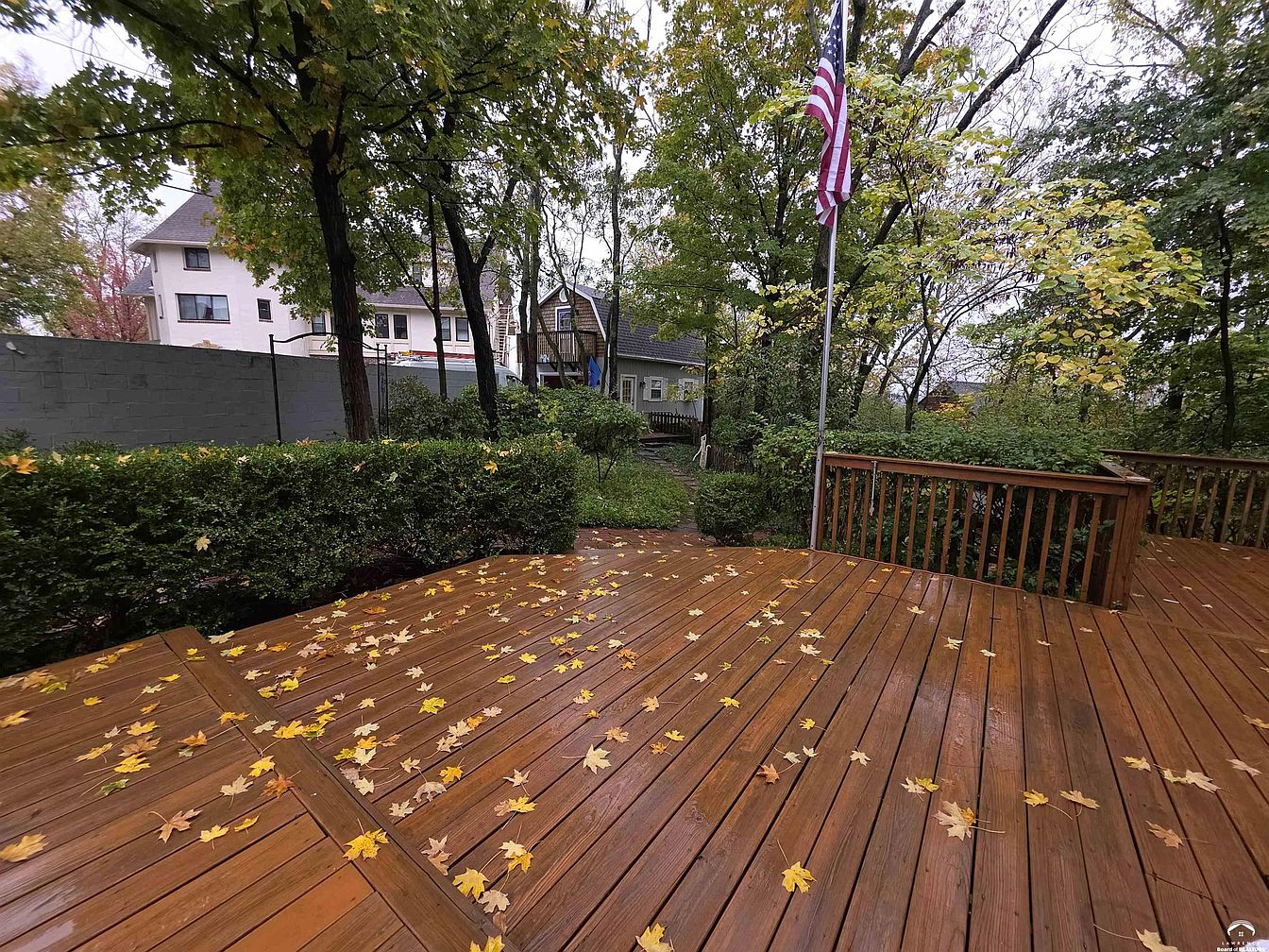 A spacious wooden deck, glistening as if recently rained on, stretches across the foreground, scattered with yellow autumn leaves. The deck features a subtle angular design and is surrounded by a simple wooden railing on one side. Manicured hedges border the deck, creating a sense of separation from the suburban backyard beyond. Mature trees with green and yellow foliage arch overhead, partially obscuring the cloudy sky. In the background, an American flag on a tall flagpole stands near the edge of the deck, while neighboring houses with vintage facades and fenced yards add to the residential, tranquil ambiance.