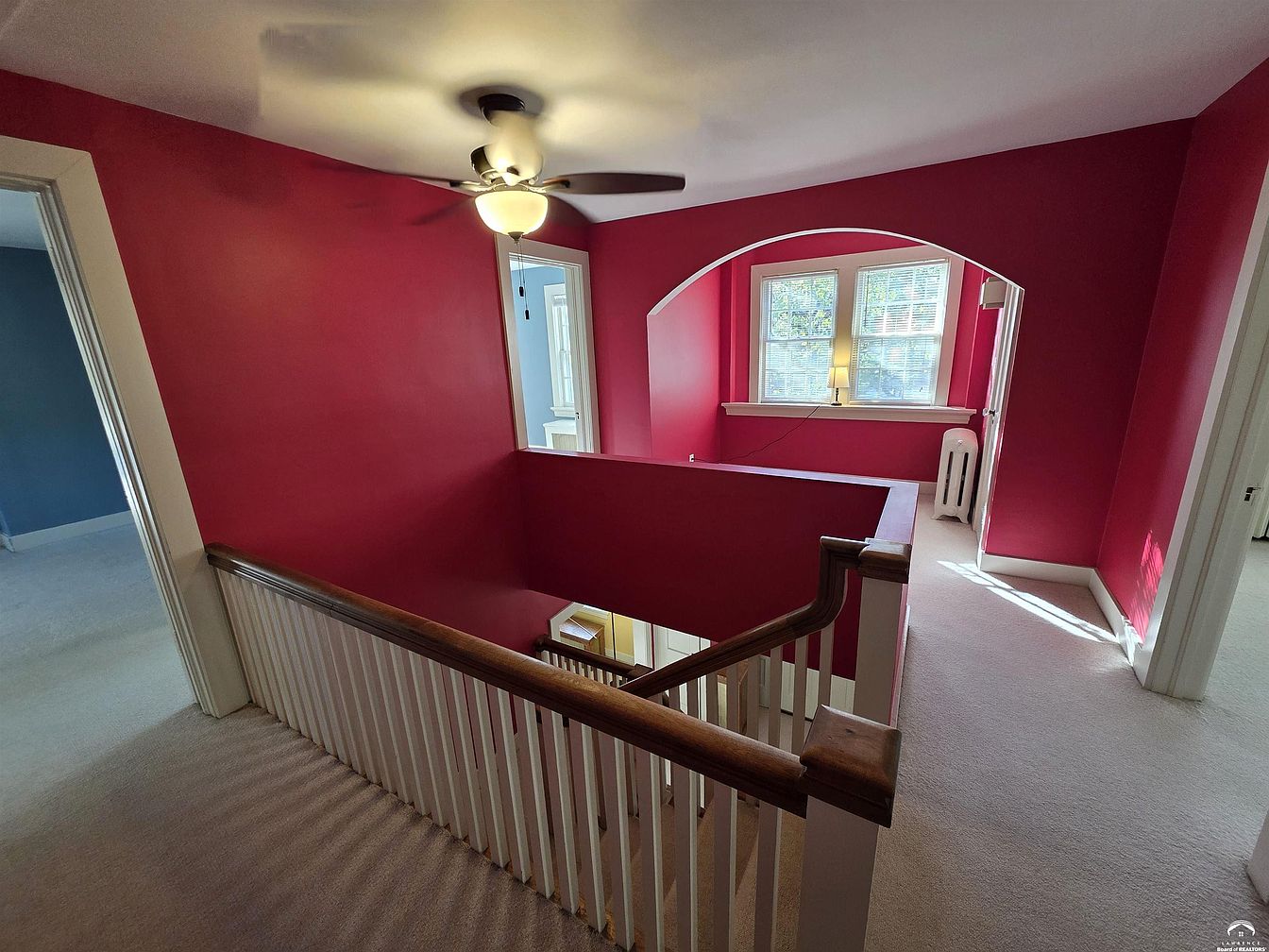 A vibrant upstairs landing features striking deep red walls contrasted with white trim, creating a bold and dramatic look. Neutral-colored carpet covers the floor, providing softness underfoot. The wooden stair railing with white balusters adds a traditional touch, while the wood-topped rail introduces warmth. Dual doorways lead to adjacent rooms painted in a calming slate blue, visible in the background and lit by abundant windows. An archway frames a cozy nook by the window, and a ceiling fan with a light fixture hangs overhead, blending functionality with classic aesthetics. The overall look is colorful, warm, and welcoming.