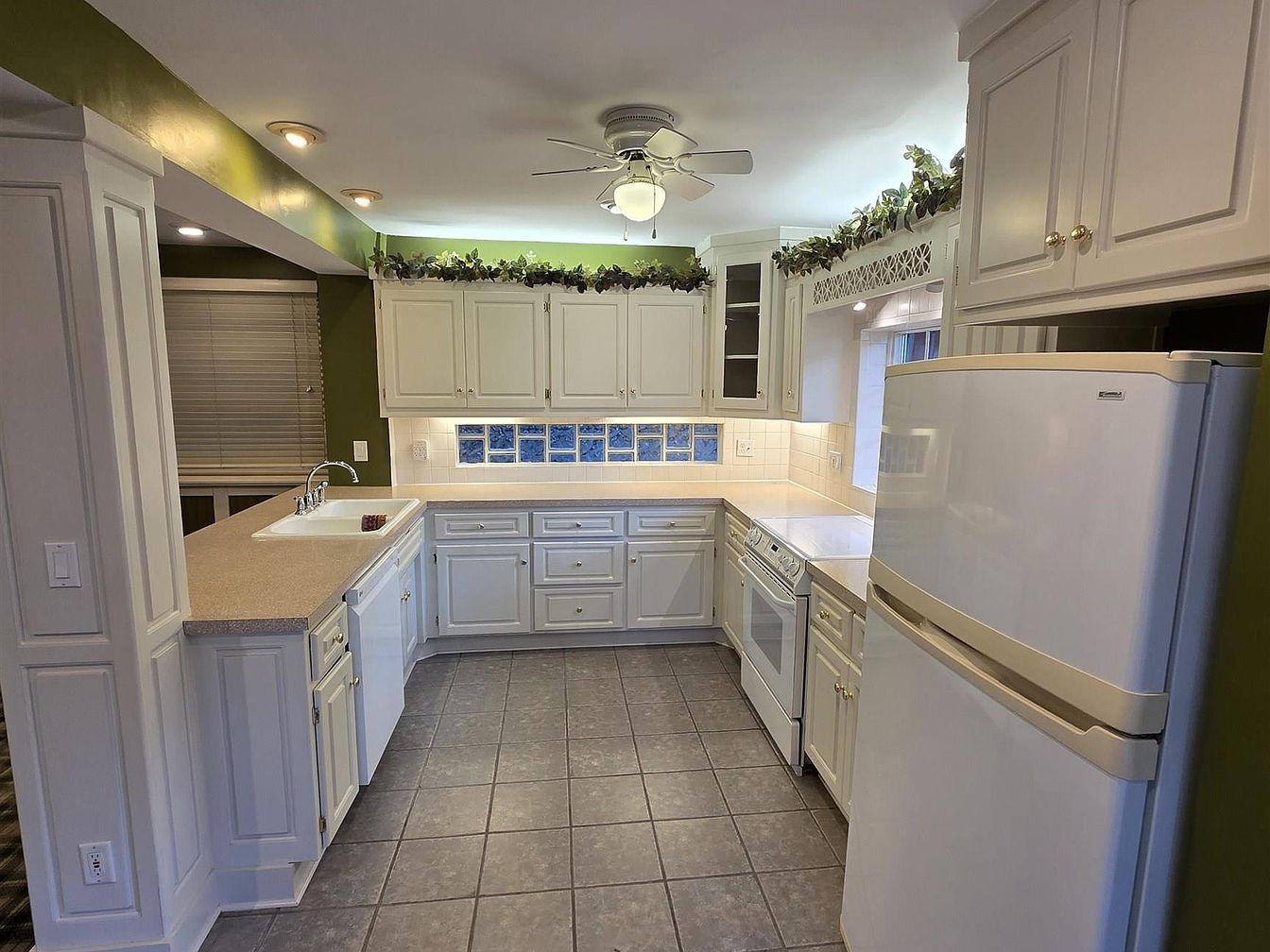 A traditional kitchen is styled with soft white cabinetry featuring paneling and brass hardware, creating an inviting atmosphere. The U-shaped counter layout maximizes workspace and includes built-in appliances such as a dishwasher and stove, all in white. A beige laminate countertop pairs subtlety with the neutral gray tiled flooring below. Crown molding runs atop the wall cabinets, with faux greenery decoratively lining the top edges. The room is softly lit by recessed ceiling lights and a small ceiling fan. Olive green paint on the walls adds warmth and contrast, while a set of square blue glass tiles in the backsplash provides a touch of color.