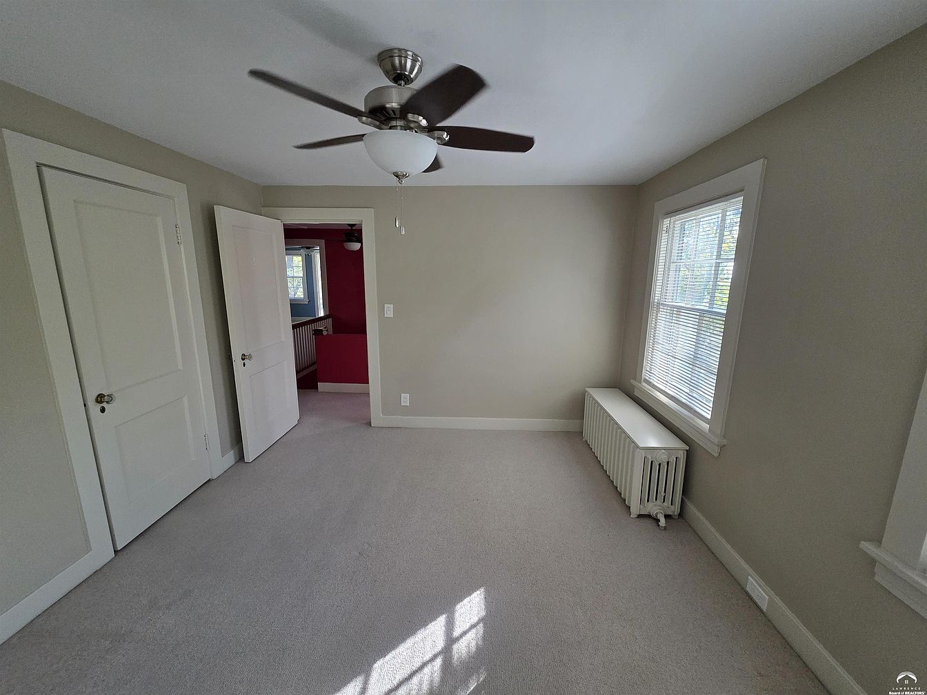 A cozy, light-filled bedroom with soft, cream-colored walls and plush, neutral carpeting. A large double window on the right lets in natural daylight, framed with white trim that matches the room’s baseboards and doors. A classic white radiator sits below the window, adding a vintage touch. Two simple panel doors, one partially open, are set on the left wall leading to adjoining rooms or closets. The ceiling features a contemporary brushed-nickel ceiling fan with white opaque light, giving a blend of historic and modern aesthetics. The room opens to a hallway with deeper red-painted walls beyond, adding visual interest.