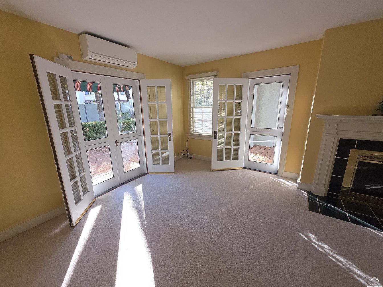 A bright living room with soft yellow walls and plush cream carpeting. Three French doors with glass panes open outward, two leading to a patio and one to a porch, allowing abundant sunlight to stream inside. There’s a large, traditional white fireplace with a black tile surround and gold accent trim on the right. Above the central set of doors is a modern wall-mounted air conditioning unit. White trim frames the windows and doors, and a single window with white blinds adds extra natural light. The overall ambiance is airy, cozy, and welcoming with classic architectural details.