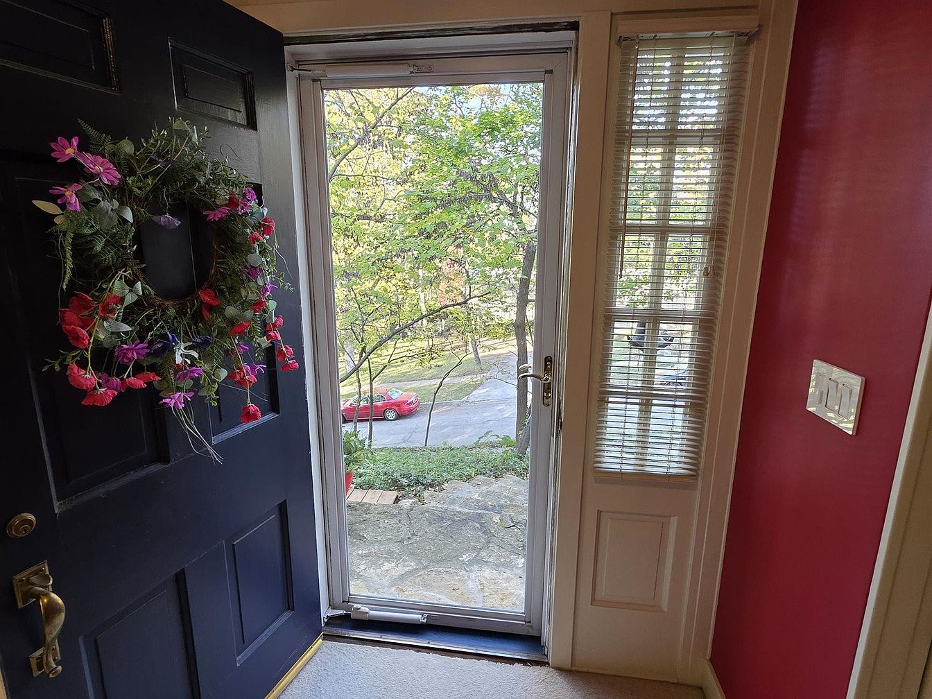 A welcoming front door opens to reveal a partial view of a well-kept entryway. The dark painted door is adorned with a lush, vibrant wreath featuring pink, purple, and red flowers with greenery, adding a cheerful touch. Surrounding the door are sidelights with classic grilles, one featuring blinds for light control. The inner wall near the door is painted a bold, deep red, contrasted by crisp white trim and door frames. Through the glass storm door, the exterior stone steps and a tree-lined street can be seen, evoking a cozy, historic charm and a connection to the greenery outdoors.