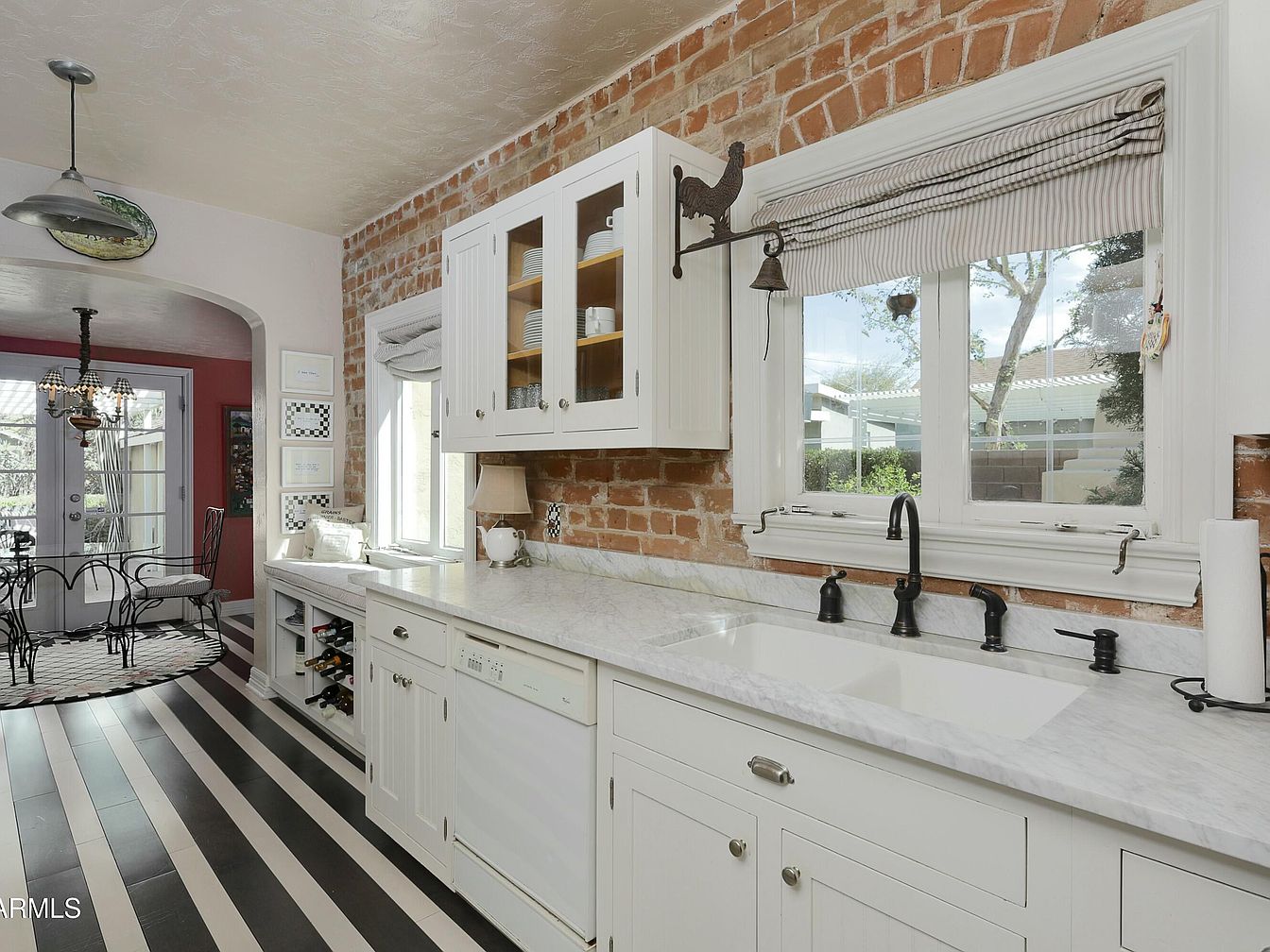 This cozy kitchen seamlessly combines rustic and modern elements. Exposed brick enhances the warm atmosphere, while sleek white cabinetry provides a contemporary contrast. A marble countertop stretches across the space, reflecting light and adding elegance. The black faucet stands out against the light hues. A large window offers a view of the outdoors, framed by striped soft drapes, contributing to the inviting aesthetic. The black-and-white striped flooring adds visual interest, guiding the eye through the space. Nearby, a charming dining area features a round black and white rug and delicate wrought iron chairs, further enhancing the kitchen’s character.