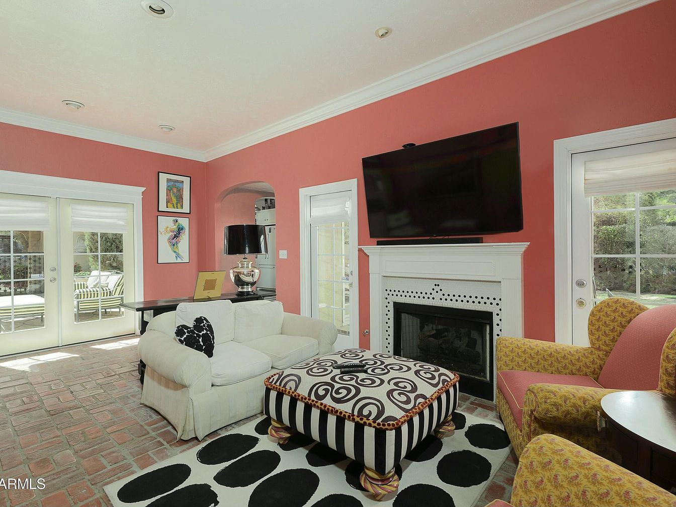 This living room features a warm coral accent wall, creating an inviting atmosphere. A cozy white sofa is paired with a boldly patterned black and white ottoman, contributing to a playful aesthetic. The space is anchored by a large area rug adorned with oversized black dots, providing contrast to the brick flooring. A modern flat-screen television is mounted above an elegant fireplace framed by white molding, which includes intricate perforated detailing. Natural light floods the room through double doors leading to an outdoor area, while artwork and a stylish lamp add personality and charm to this vibrant environment.