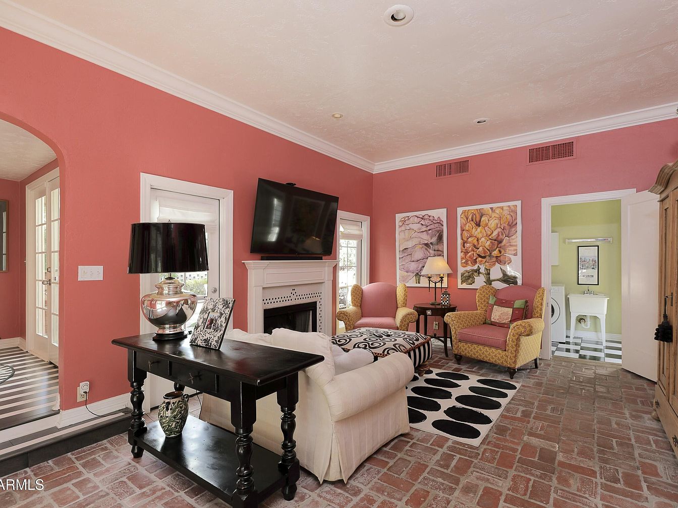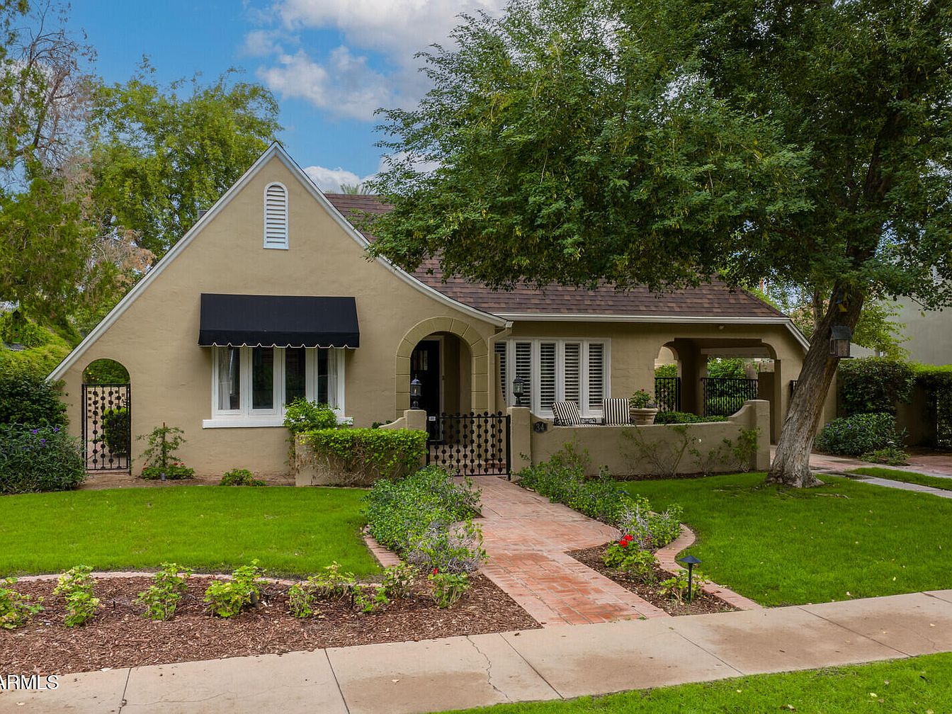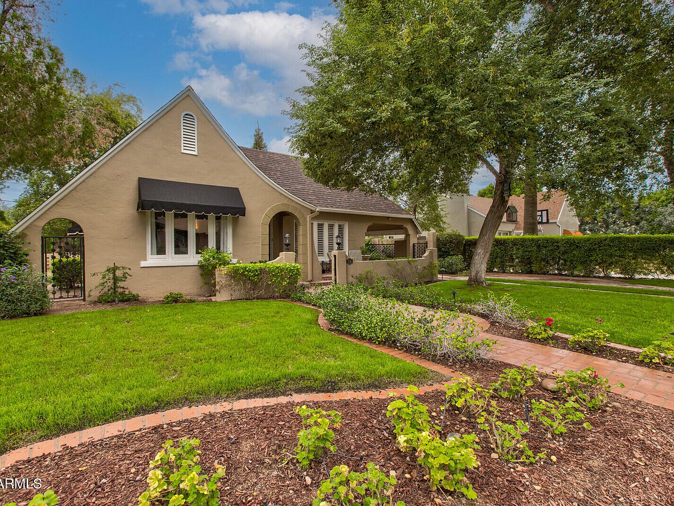 This enchanting 1927 Tudor Revival home, known as the P.W. Womack house, sits in Phoenix’s Willo Historic District, showcasing a rich architectural style with French-inspired details. Its historical significance lies in its connection to prominent local builder, P.W. Womack, enhancing the neighborhood’s legacy. Featuring a captivating façade with a steep-pitched gable roof and arched entry, the home boasts modern amenities alongside its classic charm. Recent renovations, including a brand-new roof and exterior paint, complement original hardwood floors and designer touches. The property covers a generous plot with a listing price of $1,099,000, offering ample space in a vibrant, walkable area near local attractions and the Heard Museum.