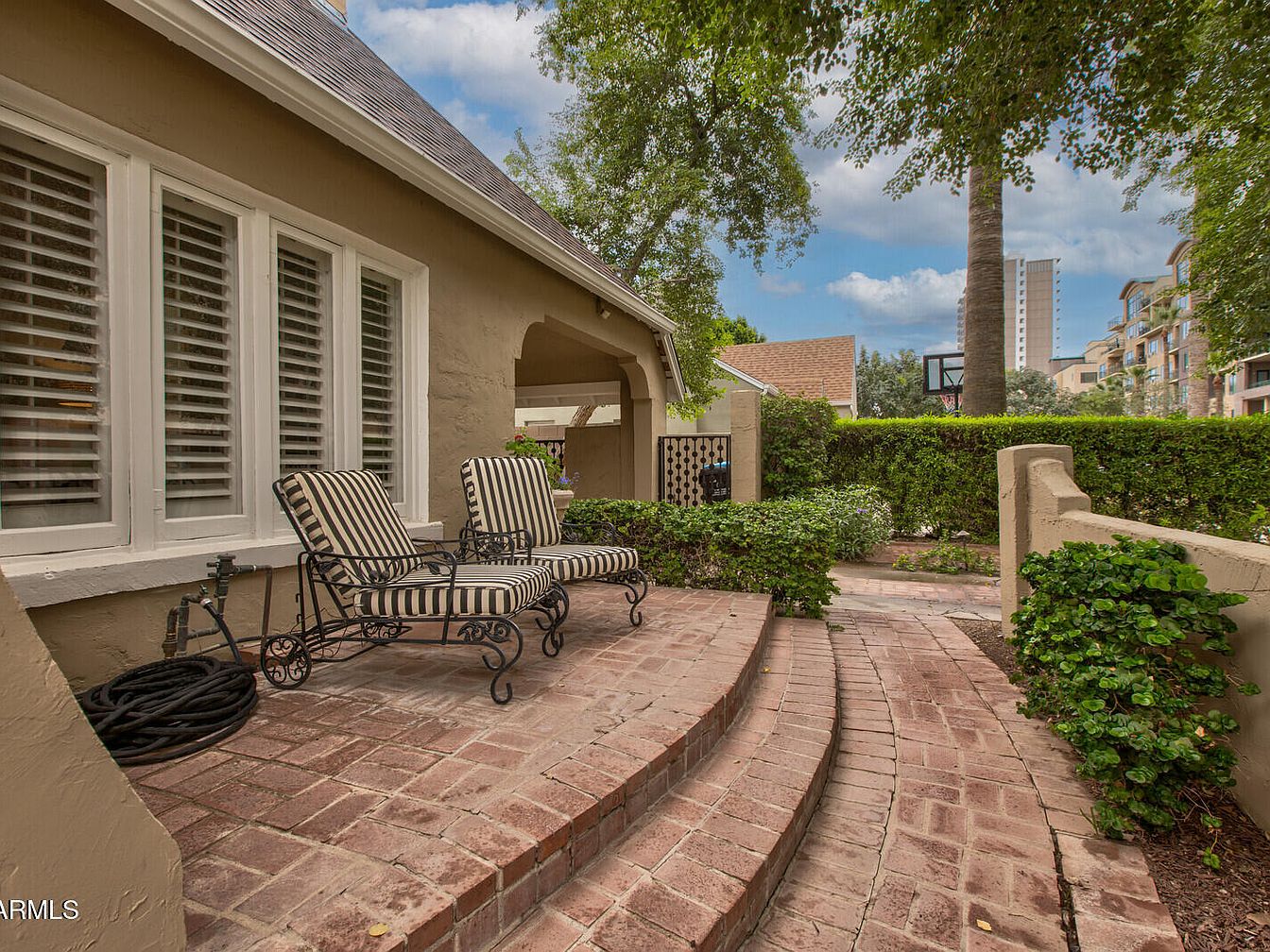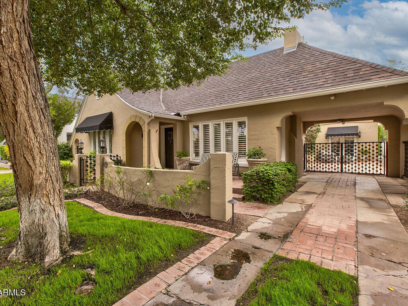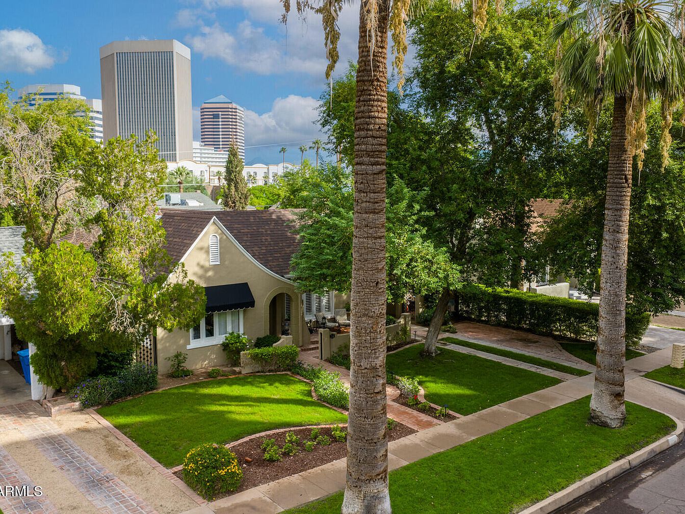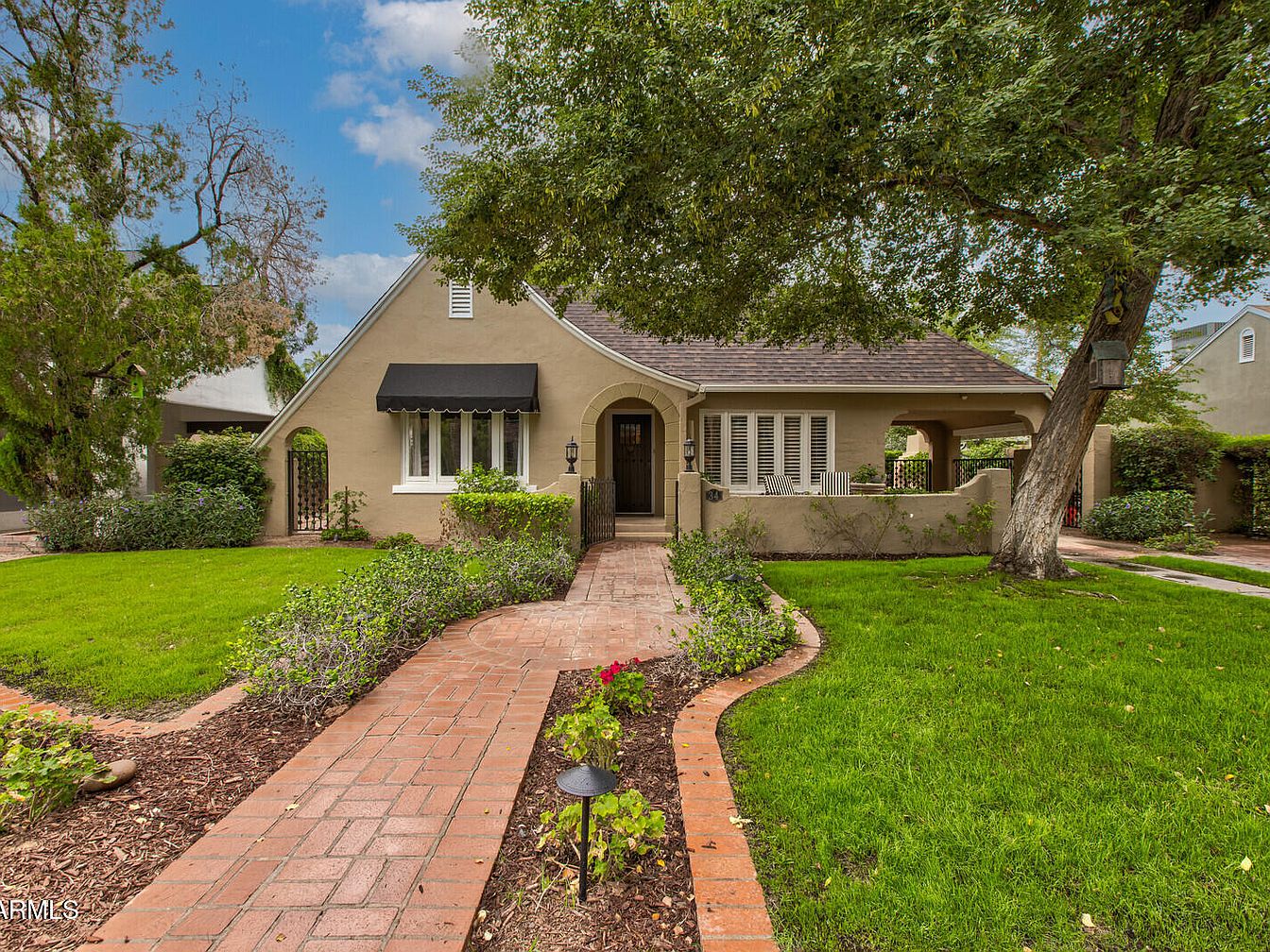 This enchanting 1927 Tudor Revival home, known as the P.W. Womack house, sits in Phoenix’s Willo Historic District, showcasing a rich architectural style with French-inspired details. Its historical significance lies in its connection to prominent local builder, P.W. Womack, enhancing the neighborhood’s legacy. Featuring a captivating façade with a steep-pitched gable roof and arched entry, the home boasts modern amenities alongside its classic charm. Recent renovations, including a brand-new roof and exterior paint, complement original hardwood floors and designer touches. The property covers a generous plot with a listing price of $1,099,000, offering ample space in a vibrant, walkable area near local attractions and the Heard Museum.