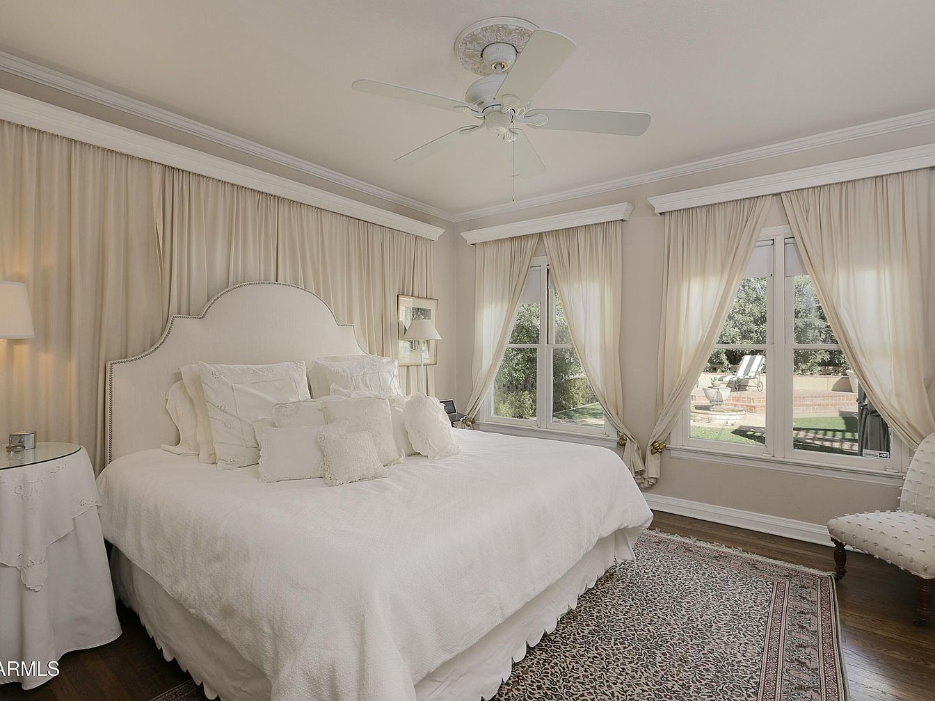 A serene bedroom design emphasizing soft textures and neutral tones. The focal point is an elegant white upholstered bed adorned with numerous plush pillows, providing a plush, inviting atmosphere. Walls are painted a light beige, complemented by delicate cream curtains framing the windows, allowing natural light to fill the space. The hardwood floor is partially covered by a richly patterned rug, adding warmth and character. A small, round bedside table features a lace tablecloth and a simple lamp, enhancing the room’s charm. Architectural details include crown molding and a classic ceiling fan, contributing to an airy, relaxed ambiance.