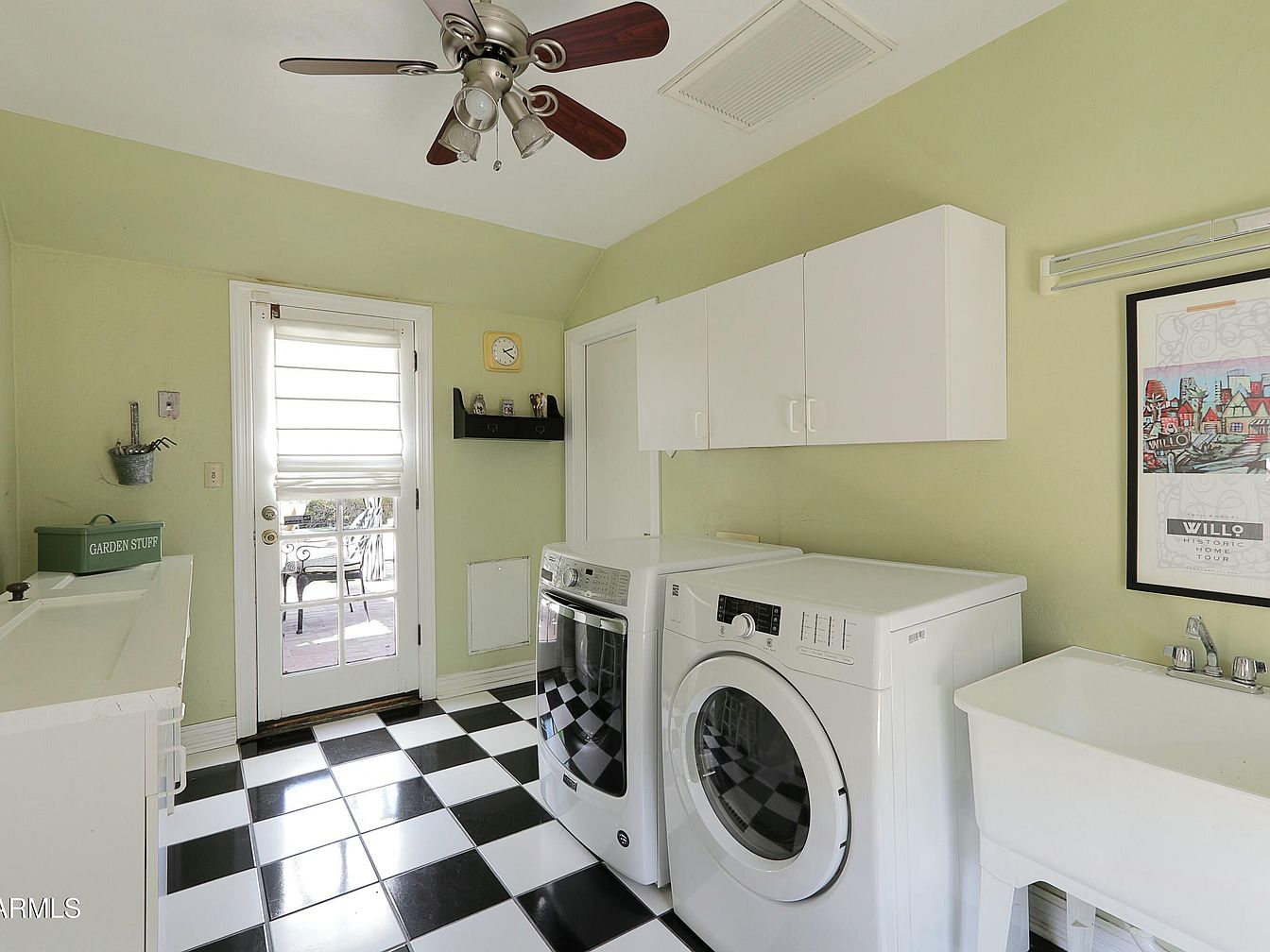 This laundry room features a vibrant light green color on the walls, creating a fresh and inviting atmosphere. The black and white checkered tile floor adds a classic touch, contrasting with the wall color. Equipped with modern appliances, a stacked washer and dryer sit neatly against one wall, while a deep laundry sink complements the setup. Above, white cabinetry offers ample storage space, keeping the area organized. A glass-paned door lets in natural light and opens to a small outdoor area, while decorative touches include a simple wall clock and a shelf with a ‘Garden Stuff’ container, emphasizing practicality.