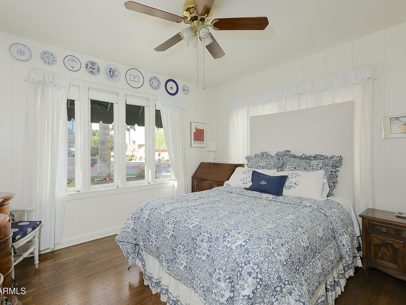 A quaint bedroom featuring a classic aesthetic with a blue and white floral bedspread atop a neatly made bed. The headboard is plush and complements a mix of decorative pillows. White drapes frame large windows, allowing natural light to fill the space. Above the bed, a collection of decorative plates adds character to the pale white walls. A wooden nightstand and an antique dresser, showcasing rich brown tones, are positioned on either side of the bed. The hardwood floor, polished and warm, enhances the room’s cozy feel, while a ceiling fan adds a vintage touch.