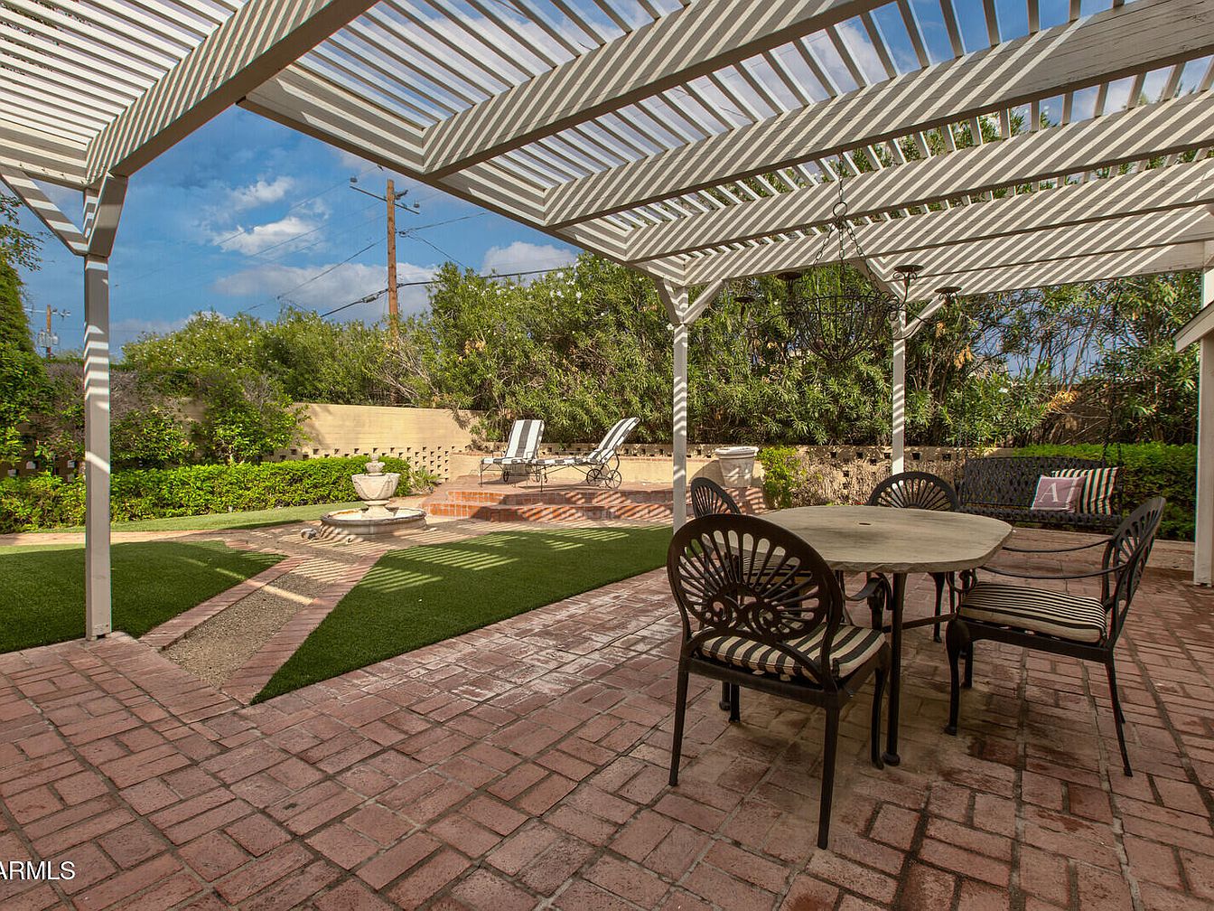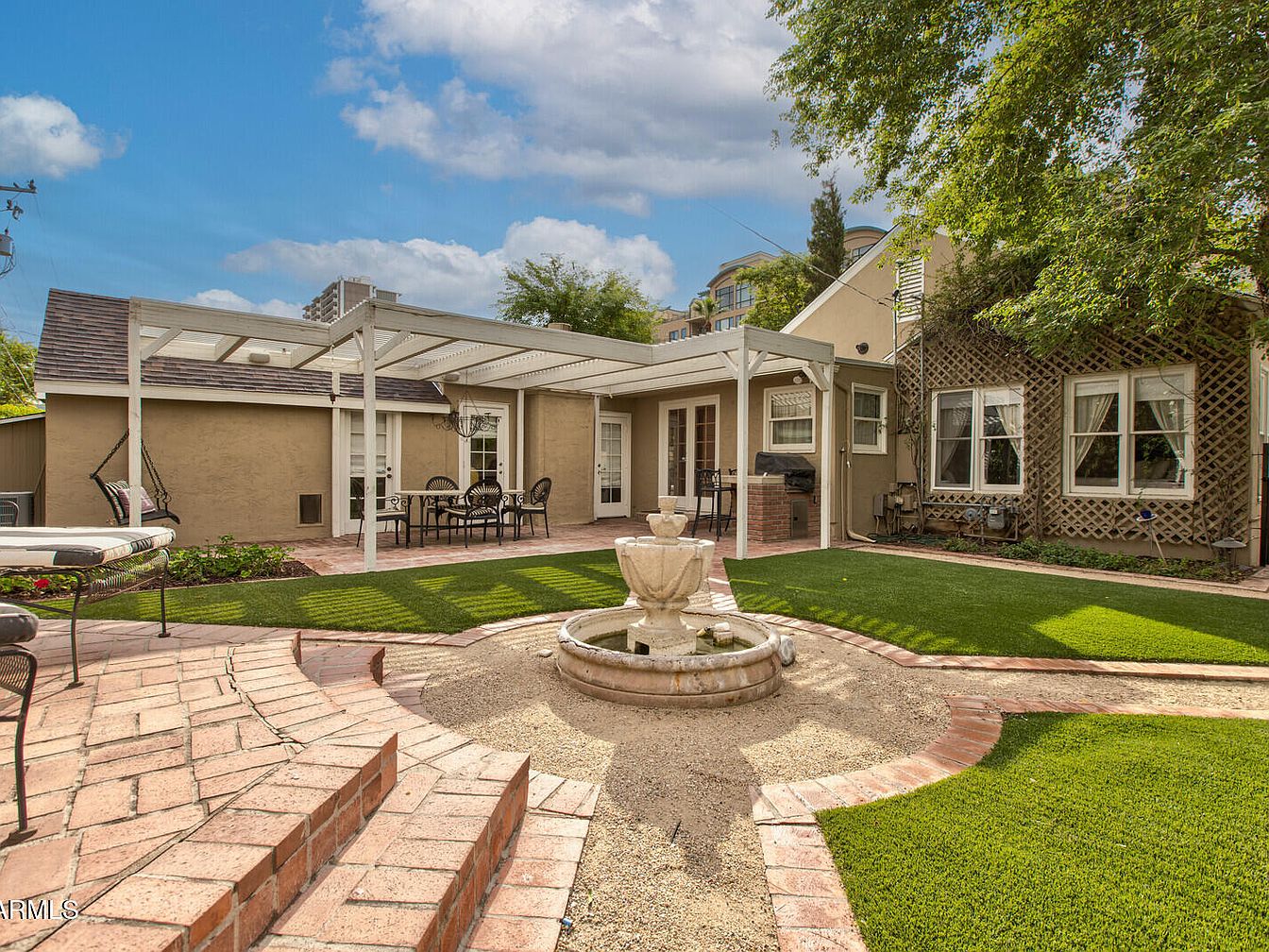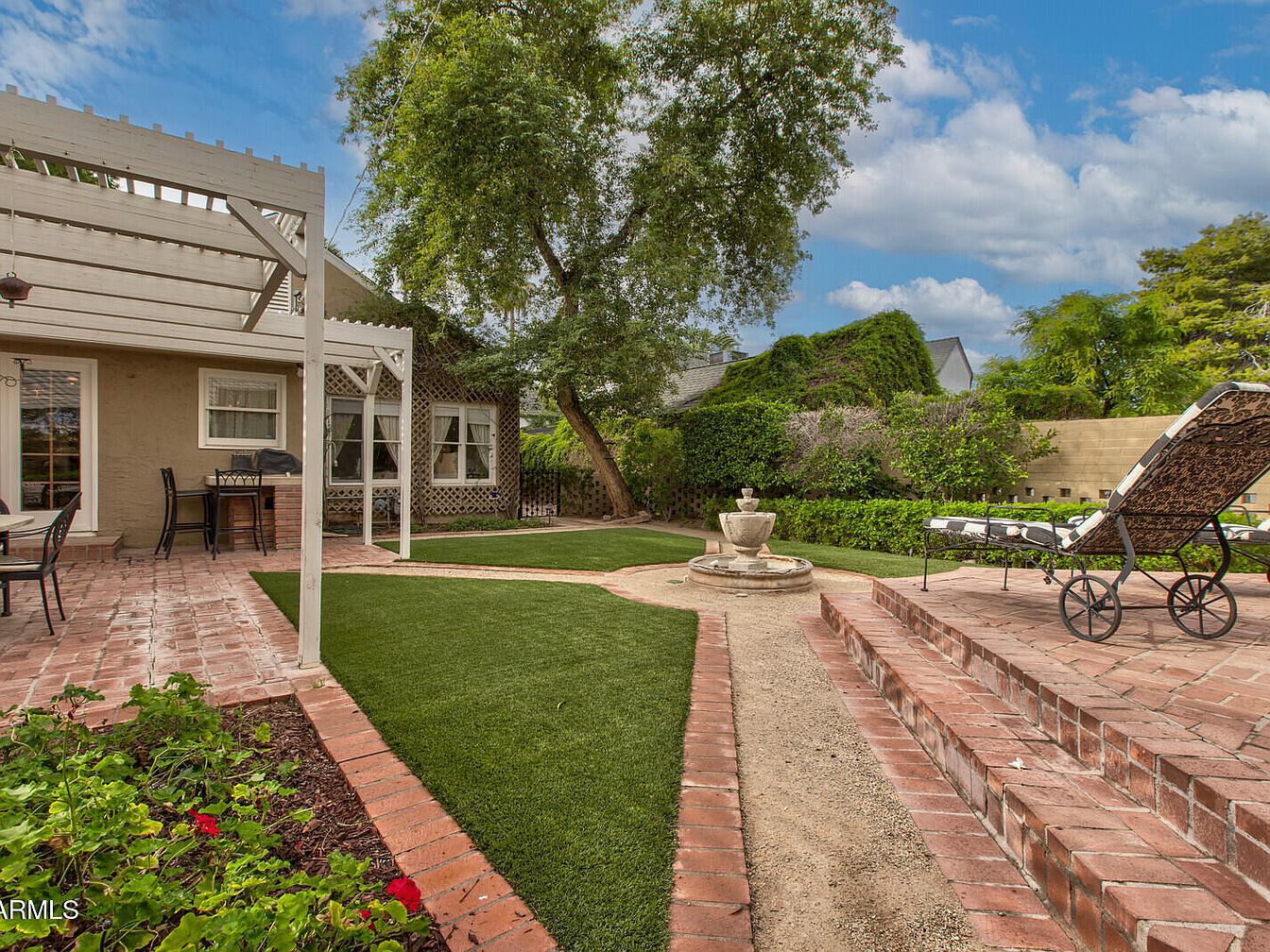 This serene backyard features a charming patio area defined by winding brick pathways and lush green artificial turf. A classic fountain serves as a focal point, surrounded by meticulously arranged landscaping. The house showcases a warm adobe exterior, enhanced by a trellis adorned with climbing plants. Dining furniture in black wrought iron contrasts beautifully with the natural elements, offering a perfect spot for gatherings. A covered patio extends the living space, providing shade and comfort. The blue sky above adds vibrancy, while nearby trees contribute to a tranquil atmosphere, ideal for relaxation and entertainment.