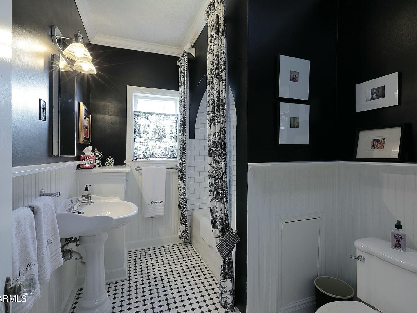 This bathroom features a striking black and white color scheme, combining bold black walls with white wainscoting. A vintage pedestal sink sits prominently, reflecting classic design. The black-and-white hexagonal tile flooring adds a timeless touch. Decorative elements include elegant wall-mounted lighting and framed artwork, enhancing visual interest. A window filters natural light through a patterned curtain, contrasting the dark walls beautifully. Towel racks showcase plush white towels, and a neatly positioned toiletries display adds practicality. Overall, the space balances modern sophistication with historic charm, creating a cozy yet stylish atmosphere.