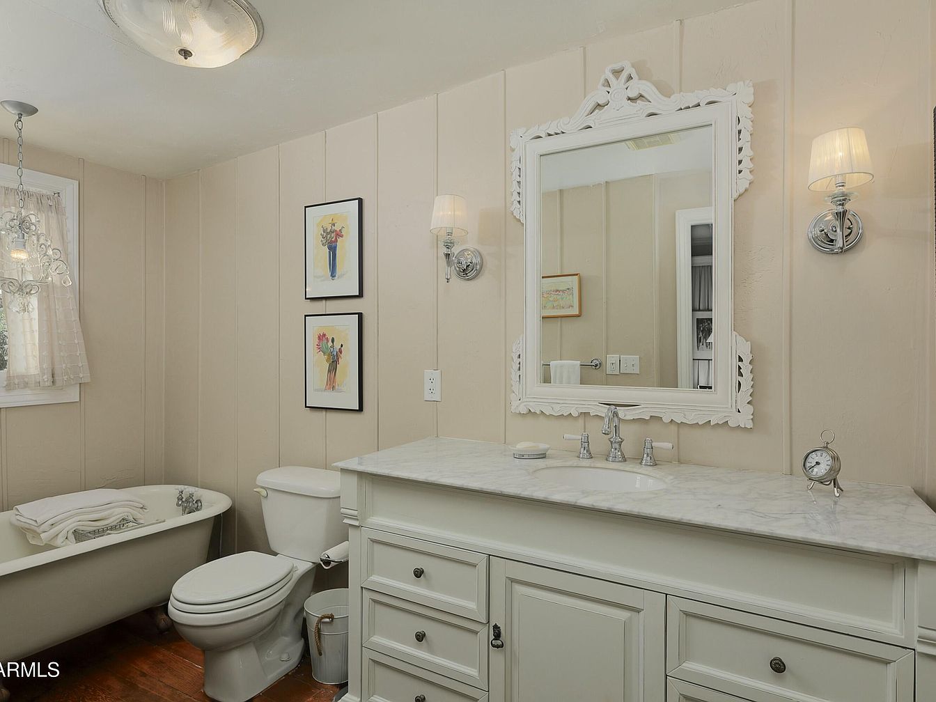 A quaint bathroom features a clawfoot bathtub against a wall with soft beige paneling, providing a warm, inviting atmosphere. Natural light filters through a window adorned with sheer white curtains, illuminating a marble countertop that complements the delicate design. A large, intricately framed mirror hangs above the sink, flanked by elegant wall sconces that add a touch of sophistication. Nearby, floral artwork in black frames enhances the space with gentle color. The cabinetry is painted a soft white, echoing the light tone of the surroundings, while vintage-inspired fixtures accentuate the charming, historic character of the room.
