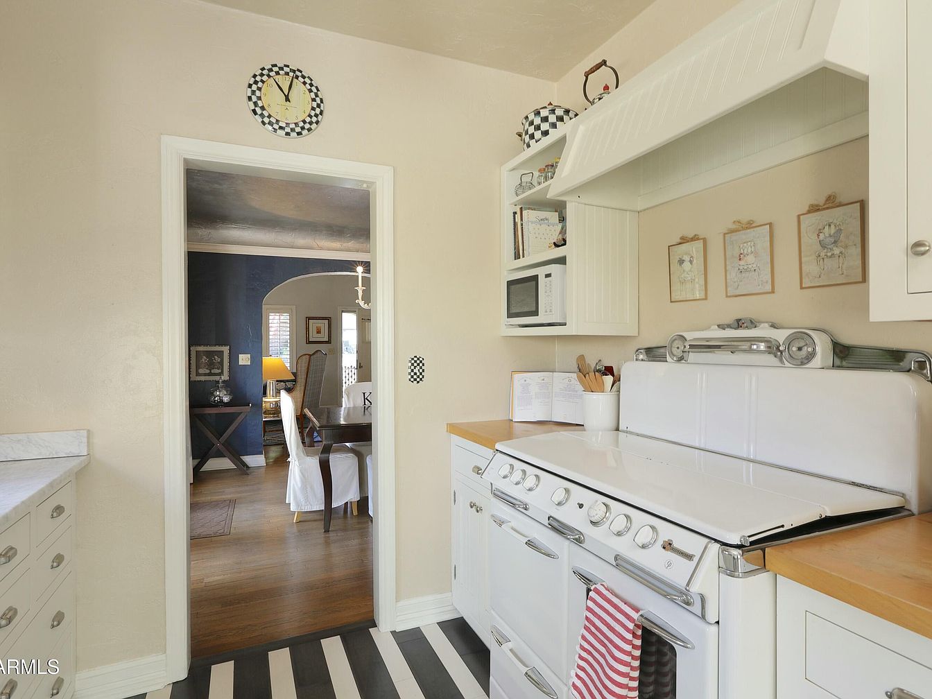 This historic kitchen showcases a blend of vintage charm and modern functionality. The white cabinetry contrasts beautifully with warm wooden countertops, while the black and white striped flooring adds a playful touch. A classic retro stove anchors the space, accompanied by a microwave for convenience. Above, a decorative range hood features subtle detailing. Adorning the kitchen walls are charming illustrations in frames, contributing to a cozy atmosphere. A round clock with a checkered design enhances the aesthetic, connecting with the overall color scheme. The open doorway leads to a space with rich blue walls and warm wooden accents, inviting natural light.