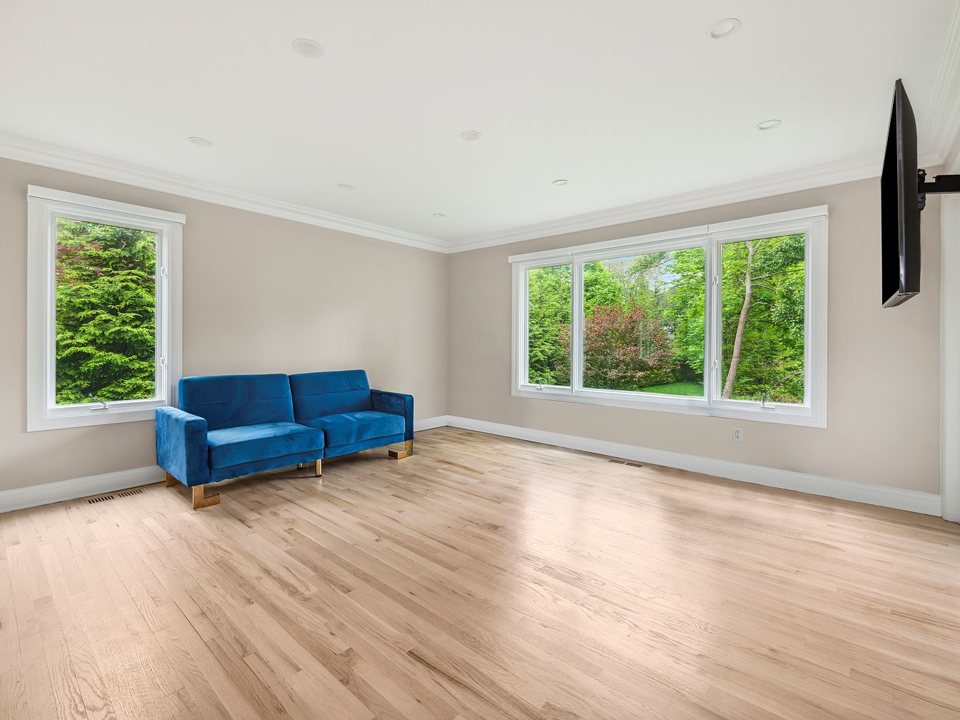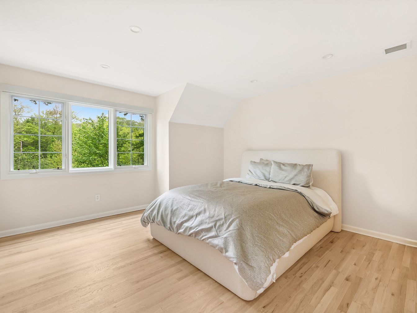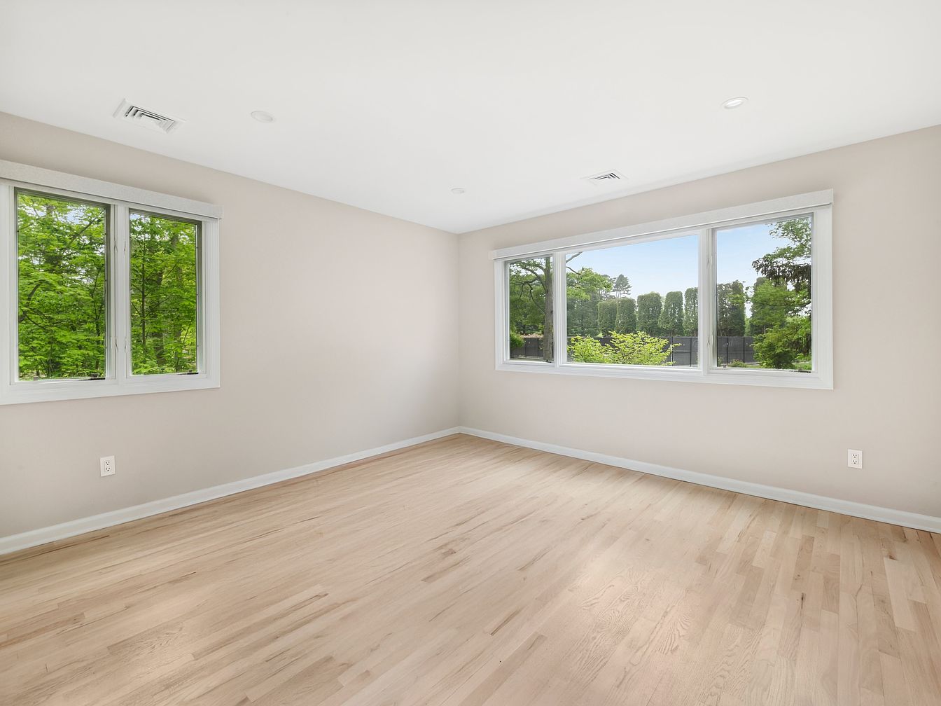 A spacious bedroom with a light, neutral color palette features smooth, beige walls and hardwood flooring that enhances the room’s bright ambiance. Natural light floods in through large windows on two sides, framed with simple white trim, offering a lush green view of trees outside. The minimalist design emphasizes open space, creating a tranquil atmosphere conducive to relaxation. The ceiling has recessed lighting, providing a warm glow, while the lack of clutter emphasizes simplicity. The clean lines and airy feel allow for personal touches in decor, making it an inviting sanctuary for comfort and rest.
