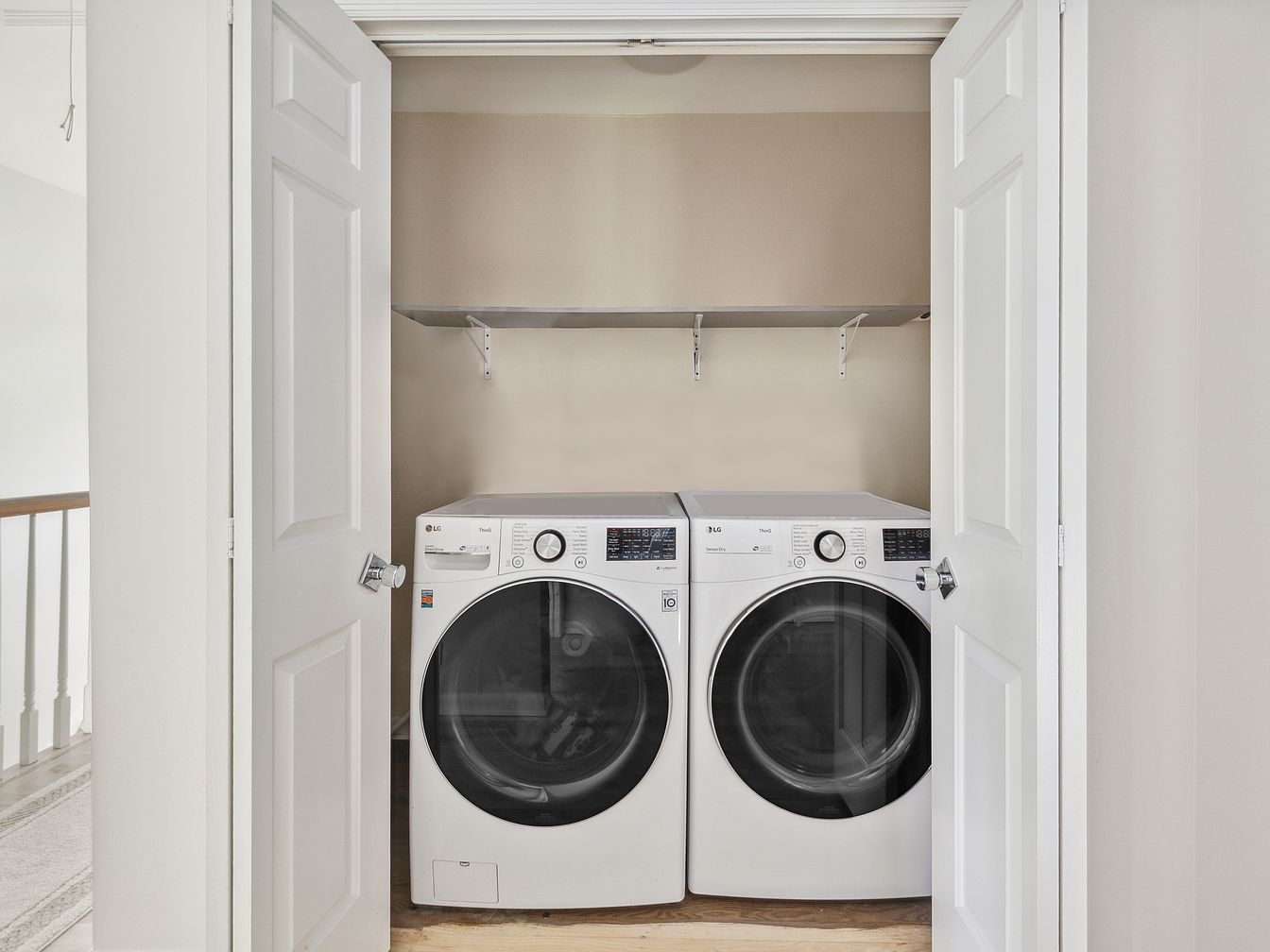 A compact laundry room featuring a sleek setup with two front-loading washers side by side. The machines have modern, metallic front panels and simple control interfaces. Above them is a minimalistic shelf, providing extra storage space for detergents or supplies, enhancing organization. The walls are painted in a soft, neutral beige, creating a calm atmosphere, while the light-colored flooring adds warmth. The space feels functional yet inviting, accentuated by bright overhead lighting. Double doors made of white paneling open into the room, emphasizing accessibility and convenience within the home’s design.