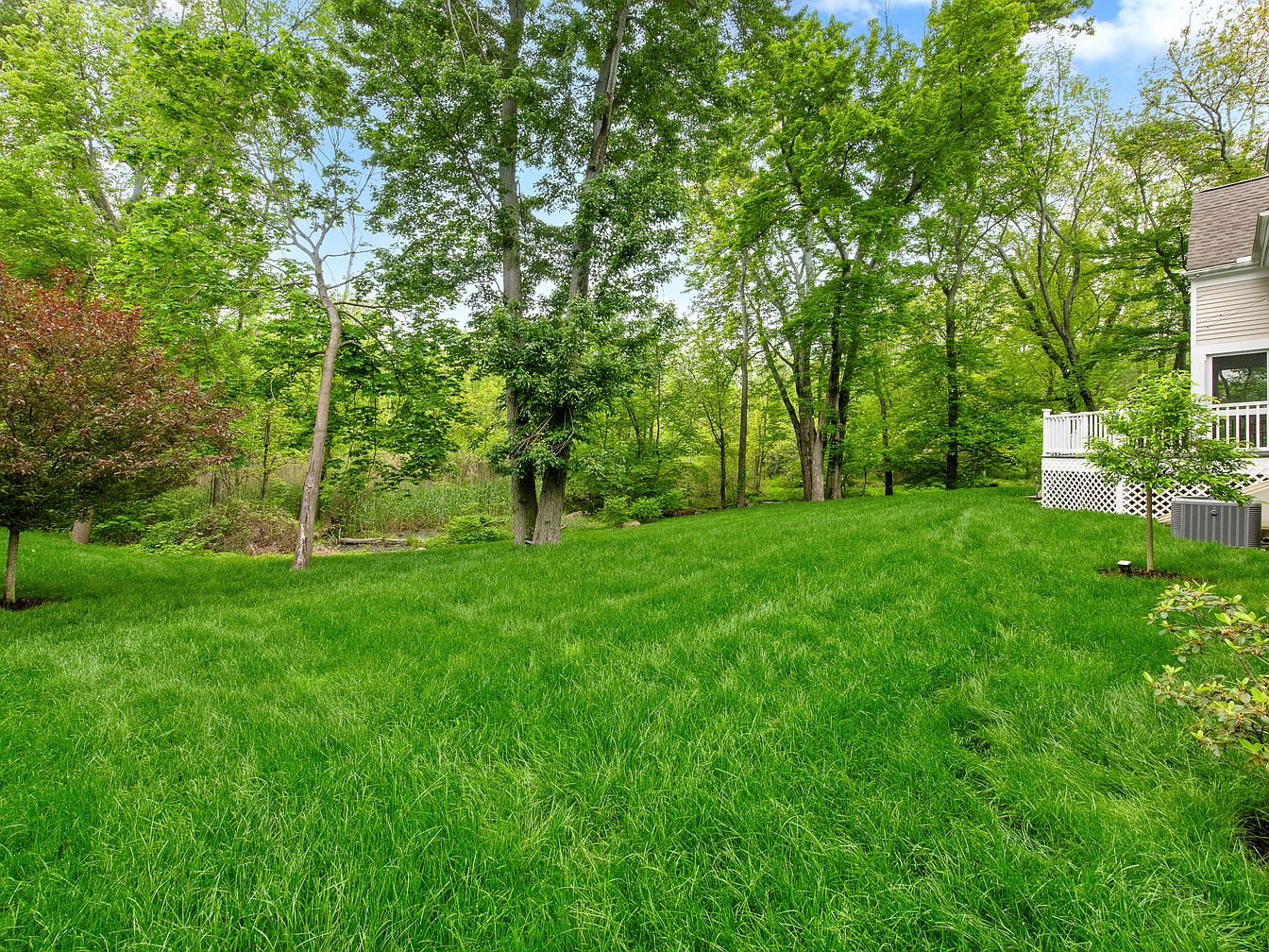 This backyard features an expansive, lush green lawn, offering a vibrant setting surrounded by dense trees. Different foliage varieties, including a red-leafed tree, create visual interest and depth. The grass appears healthy and well-maintained, inviting outdoor activities. To the right, a deck with white railing suggests a comfortable space for relaxation, harmonizing with the natural surroundings. Sunlight filters through the canopy, casting dappled shadows on the ground. The overall ambiance is serene and tranquil, making this outdoor space ideal for family gatherings or quiet reflection amidst nature’s lush beauty.