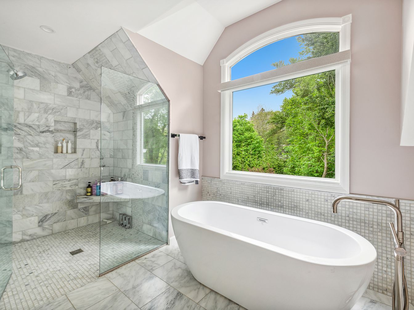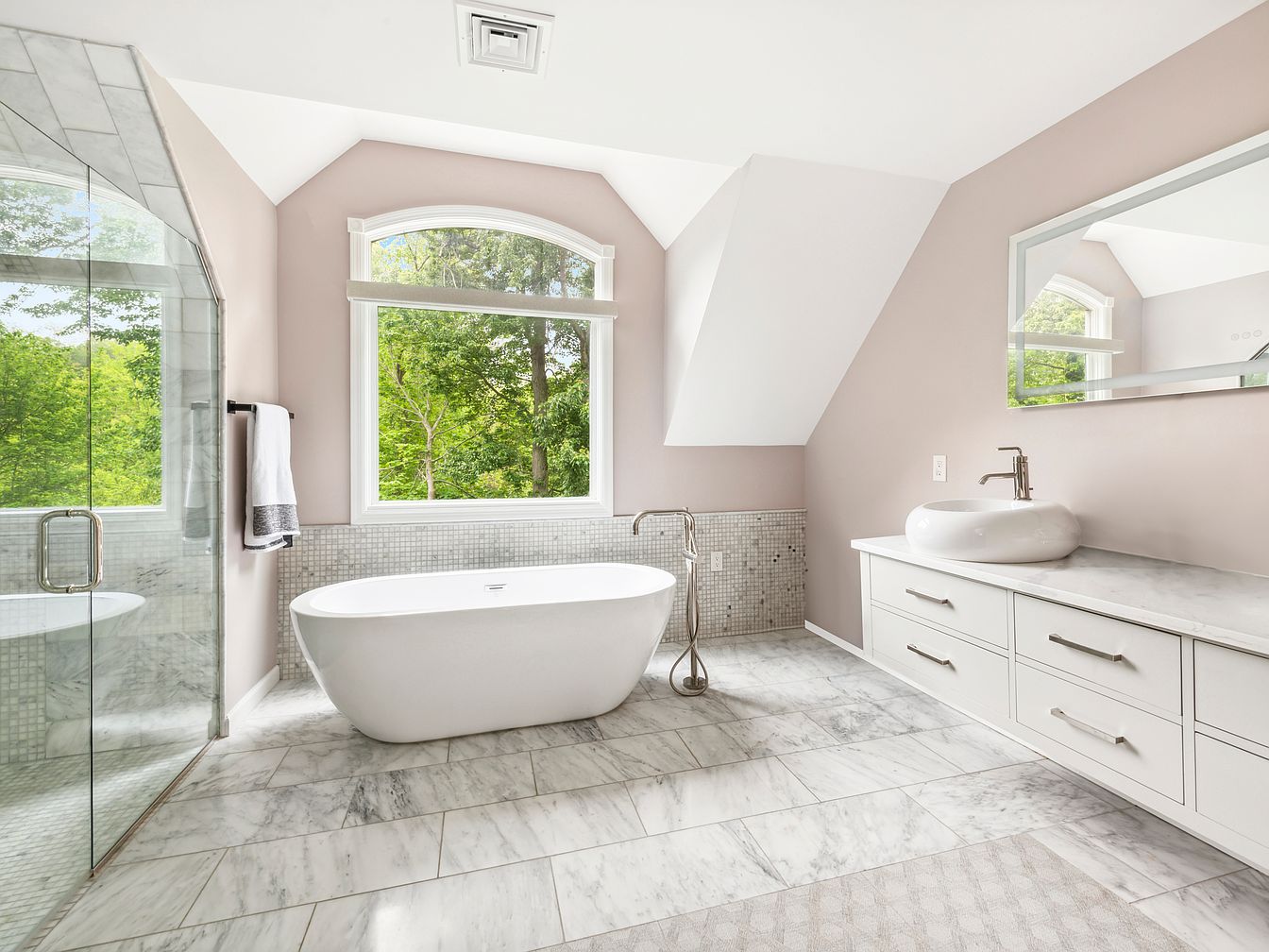 This elegant bathroom features a luxurious freestanding bathtub positioned gracefully under a large arched window, allowing natural light and views of the lush greenery outside. The color scheme combines soft pink walls with cool gray marble tiles, enhancing a calm atmosphere. A spacious glass-enclosed shower showcases intricate marble patterns, complemented by a built-in shelf for toiletries. The hexagonal mosaic flooring adds texture, while sleek metallic fixtures offer a modern touch. The design combines functionality with aesthetics, creating a serene retreat perfect for relaxation and rejuvenation.
