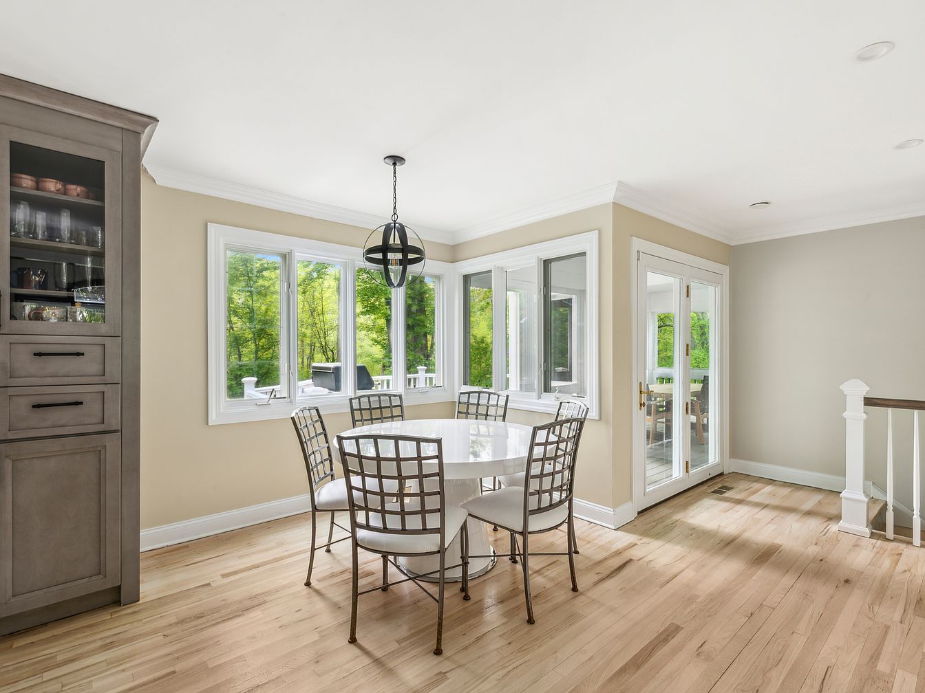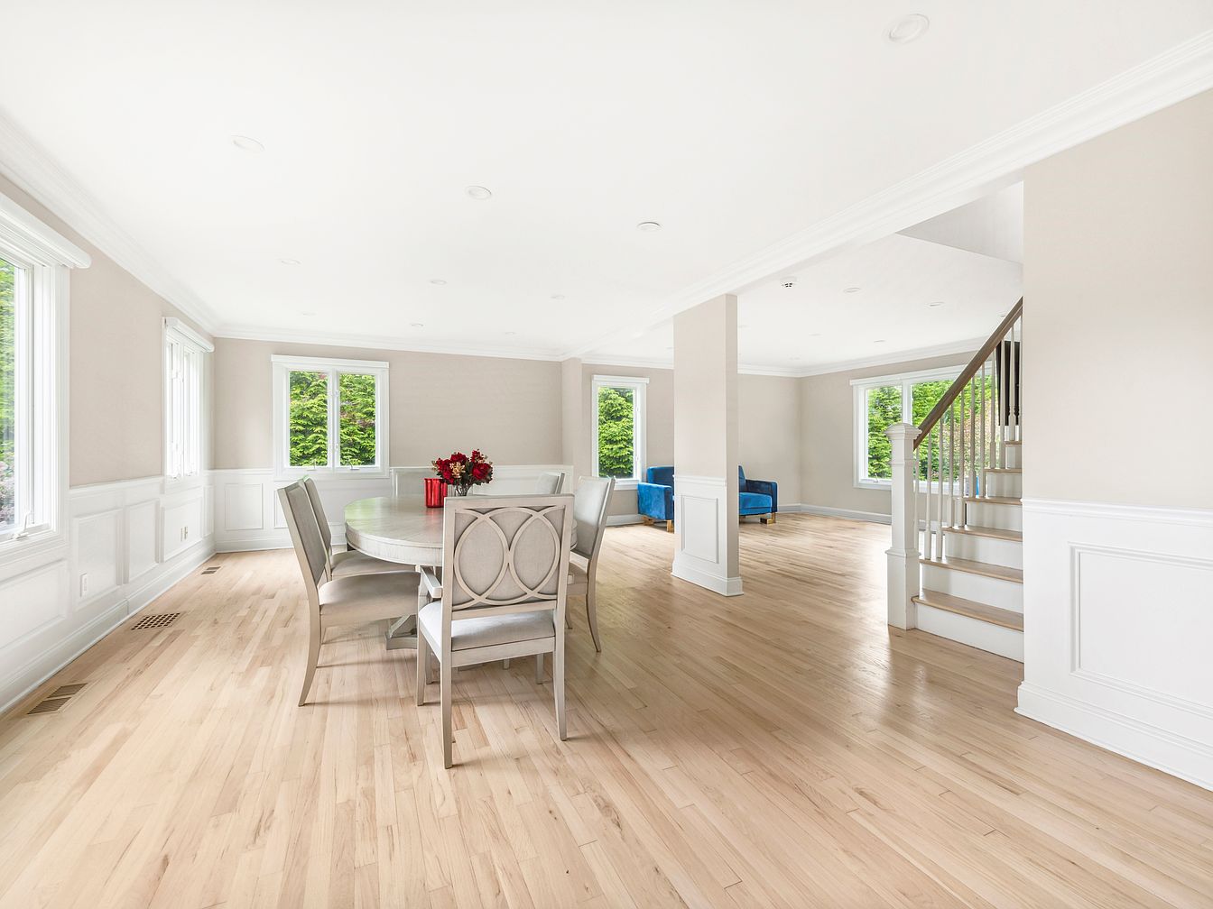 A spacious dining room features a large round wooden table surrounded by elegant, upholstered chairs, offering a sophisticated yet inviting atmosphere. The light taupe walls complement the white wainscoting and crown molding, enhancing the room’s classic appeal. Natural light floods the space through expansive windows, presenting views of lush greenery outside. The warm, honey-toned hardwood floor adds warmth, contrasting beautifully with the light furniture. A centerpiece of vibrant flowers sits atop the table, bringing a pop of color. Recessed lighting in the ceiling provides illumination, creating a bright and airy environment perfect for gatherings.