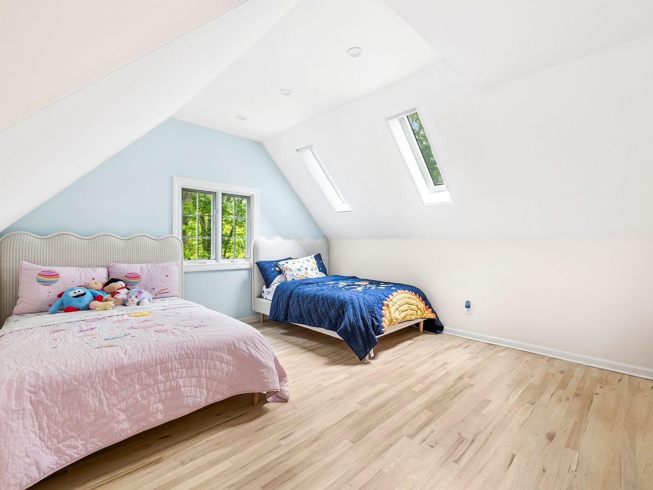 This cozy bedroom features a sloped ceiling adorned with skylights, allowing natural light to flood the space. The walls are painted in a soft blue hue, contrasting with the white ceiling, creating a calm atmosphere. Two beds are positioned: one with a pink quilted coverlet and fluffy pillows featuring colorful designs, surrounded by plush toys, and another in deep blue with playful patterns. The light hardwood flooring adds warmth to the room. A neatly framed window offers a glimpse of surrounding greenery, enhancing the tranquil vibe. Overall, the space promotes relaxation and comfort for its inhabitants.