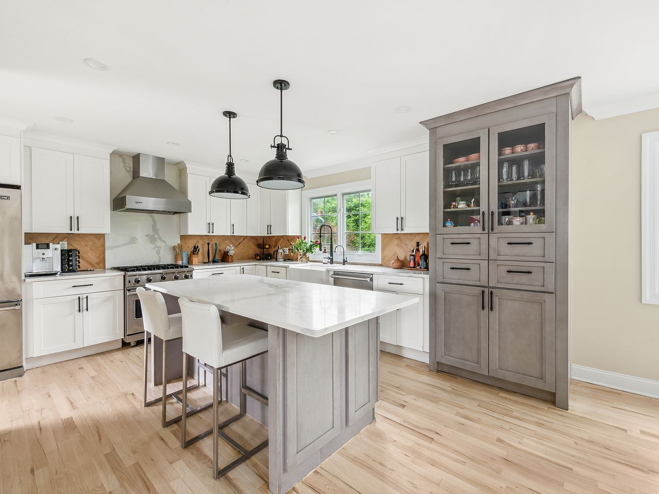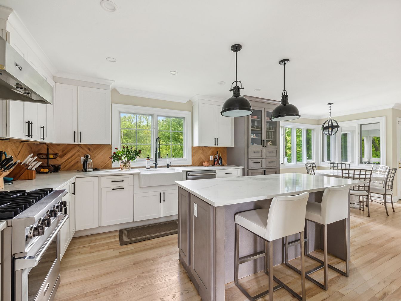 This modern kitchen features a spacious layout with an inviting island at its center, complemented by sleek bar stools. The cabinetry is predominantly white, blending beautifully with the dark grey base cabinets, creating a striking contrast. A herringbone-patterned backsplash adds texture behind the stainless steel stove, enhancing the contemporary feel. Natural light floods the space through large windows, accentuating the warm wooden flooring, while pendant lights with a matte black finish punctuate the ceiling, adding a touch of sophistication. The farmhouse sink is aesthetically practical, further elevating the kitchen’s modern yet cozy ambiance.