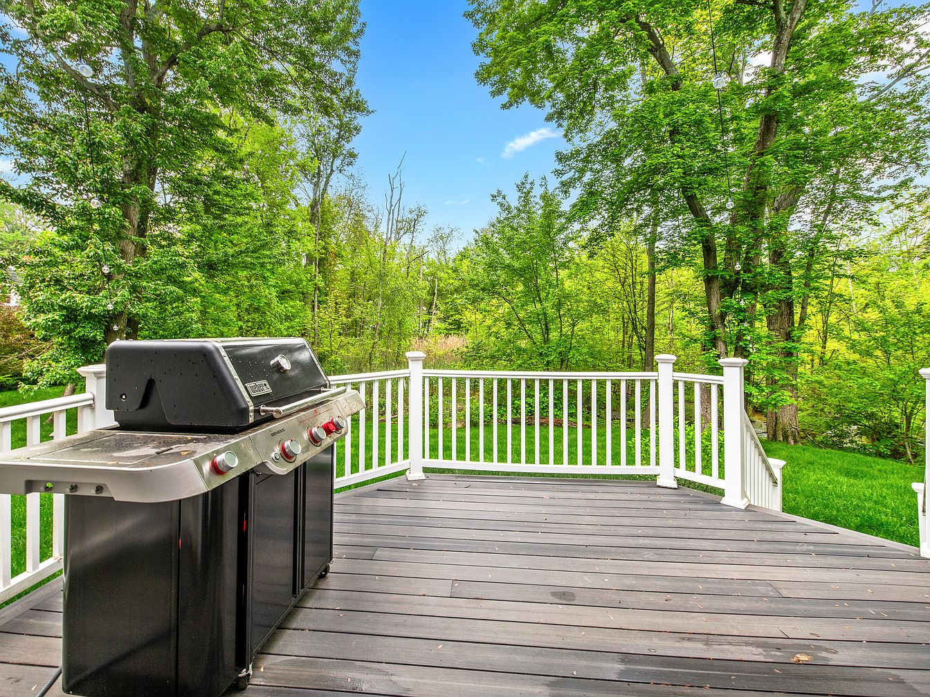 This outdoor space features a spacious wooden deck, expertly crafted from dark-stained planks that provide a modern contrast to the lush greenery surrounding it. A sleek, black gas grill is positioned prominently, indicating a focus on outdoor cooking and entertaining. The white railing adds a touch of charm, seamlessly blending functionality with aesthetics, while creating an open, airy feel. Towering trees and thick foliage create a natural privacy screen and enhance the serene atmosphere. The overall design encourages relaxation, with ample space for seating and social gatherings, perfect for enjoying warm summer evenings.