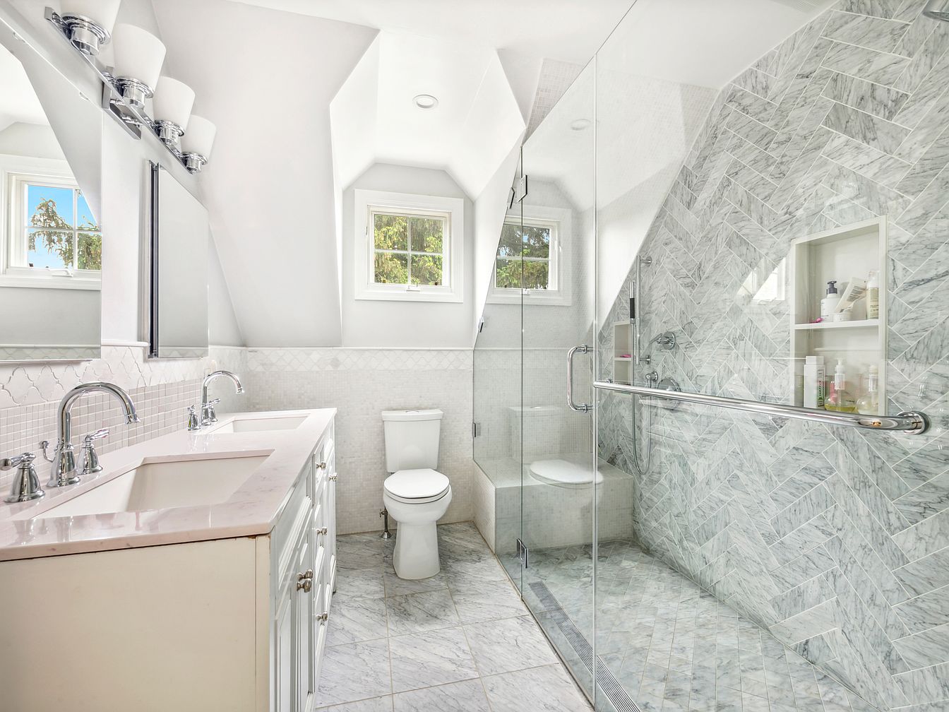 This bathroom features a modern design with a sloped ceiling enhancing its unique character. The color scheme combines soft whites and light gray marble, creating a fresh and airy atmosphere. A double vanity with white cabinetry and light pink countertops provides ample space for daily routines. Sleek chrome fixtures complement the overall sophistication. A glass-enclosed shower showcases a herringbone-patterned marble tile accent wall, adding visual interest. Natural light floods in through the windows, highlighting the subtle textures in the materials. The layout ensures functionality while maintaining an elegant and inviting ambiance.