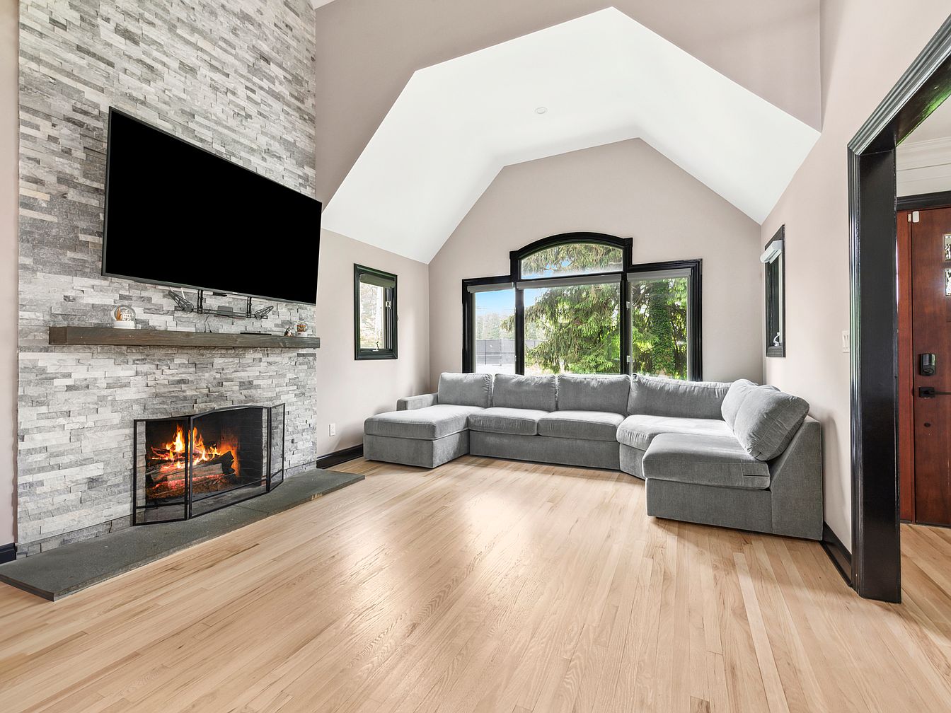 This spacious living room features a high, vaulted ceiling with a unique architectural design. A stunning stone fireplace serves as a focal point, surrounded by a clean, modern mantel. The warm-toned hardwood floor complements the soft gray of the plush sectional sofa, fostering an inviting atmosphere. Large windows allow natural light to pour in, enhancing the room’s openness and framing views of the surrounding greenery. The walls are painted in a subtle beige, harmonizing effortlessly with dark window frames and trim. A flat-screen TV mounted above the fireplace offers modern entertainment amidst a cozy, sophisticated setting.