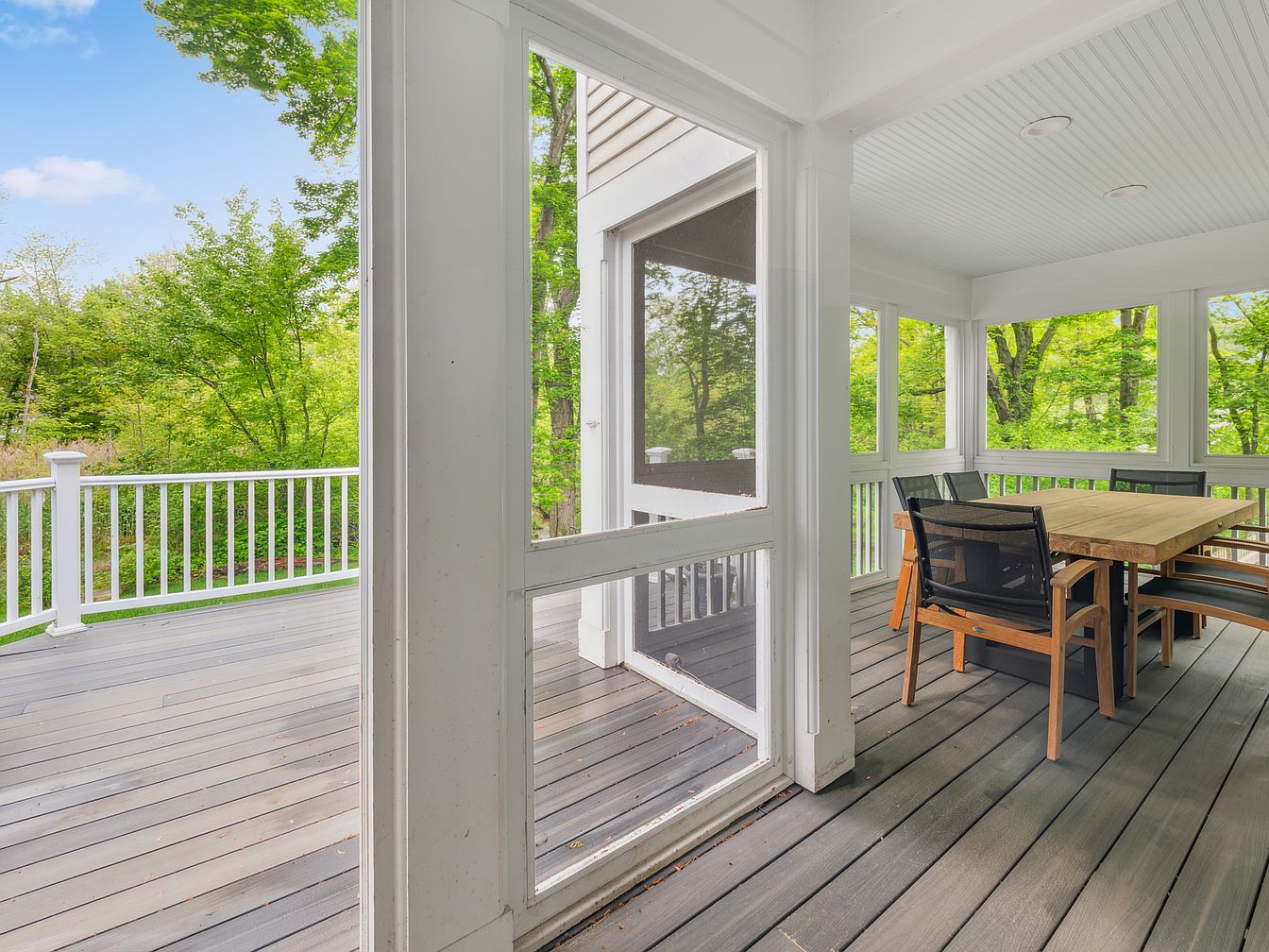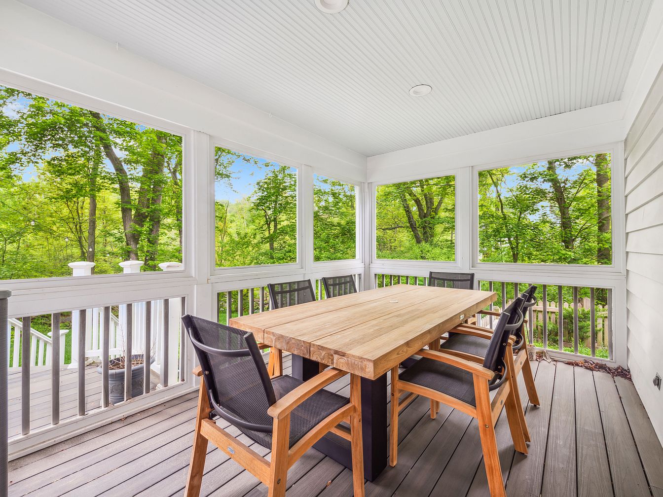This screened porch features a spacious layout with an inviting wooden dining table surrounded by black mesh chairs, perfect for outdoor dining while enjoying nature. The floor is crafted from gray decking boards, adding a modern touch. Bright natural light floods the space through large screens that provide panoramic views of lush greenery outside. The ceiling, clad in white beadboard, enhances the airy feeling. Simple white railings frame the area, creating a seamless transition from indoor to outdoor. Overall, the aesthetic is rustic yet contemporary, promoting a serene experience amidst the surrounding trees.