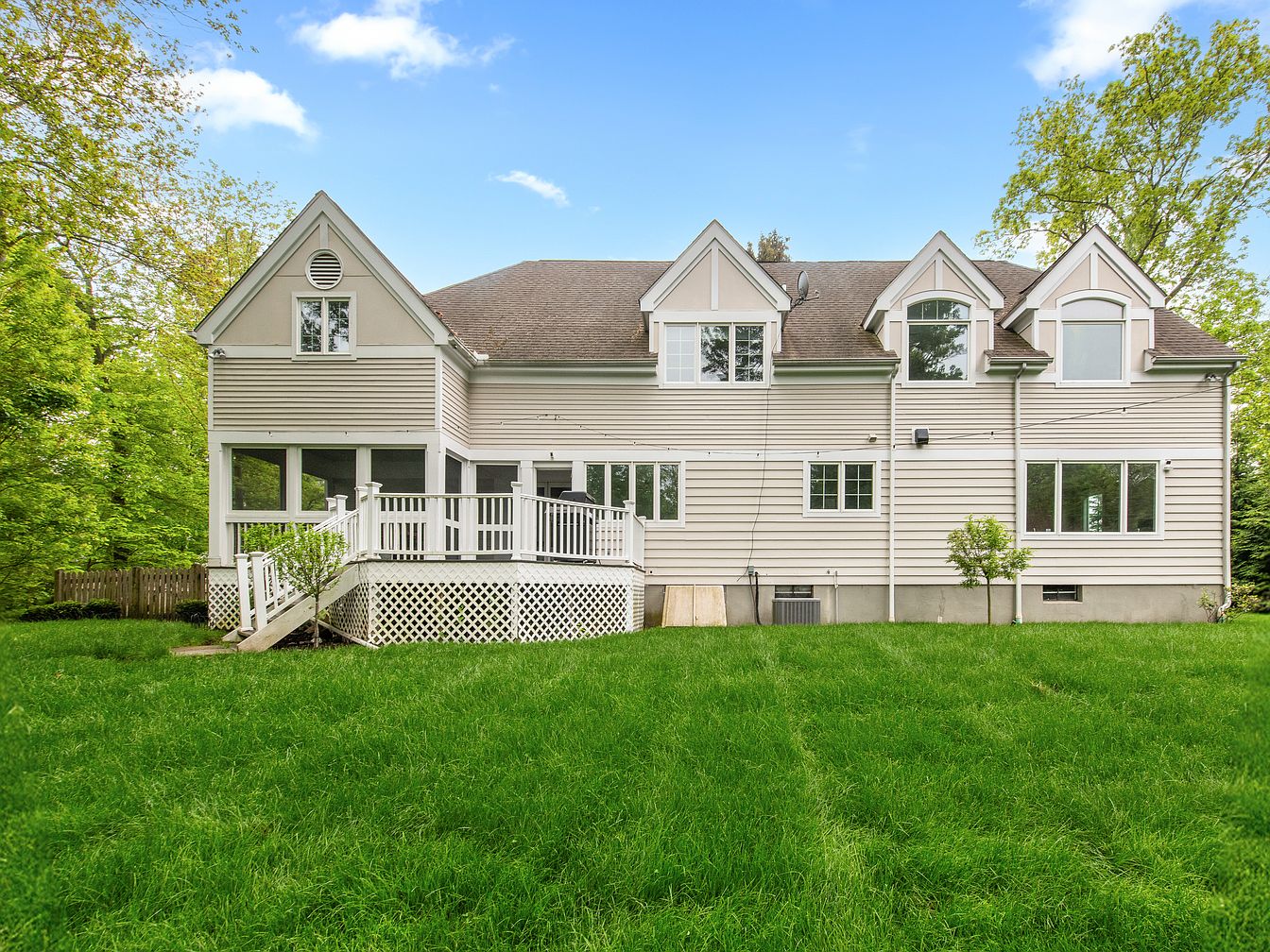 This image shows the rear façade of a historic American home, featuring a charming blend of architectural details. The exterior is painted in soft beige, complemented by white trim and a lattice-work skirt around the raised deck. A spacious deck extends from the house, surrounded by vivid green grass, ideal for outdoor leisure. Multiple large windows allow natural light to flood the interior, reflecting a serene outdoor landscape. The house showcases symmetrical gables and a mix of steep and shallow rooflines, with verdant trees framing the view, creating a tranquil setting that welcomes relaxation and connection with nature.