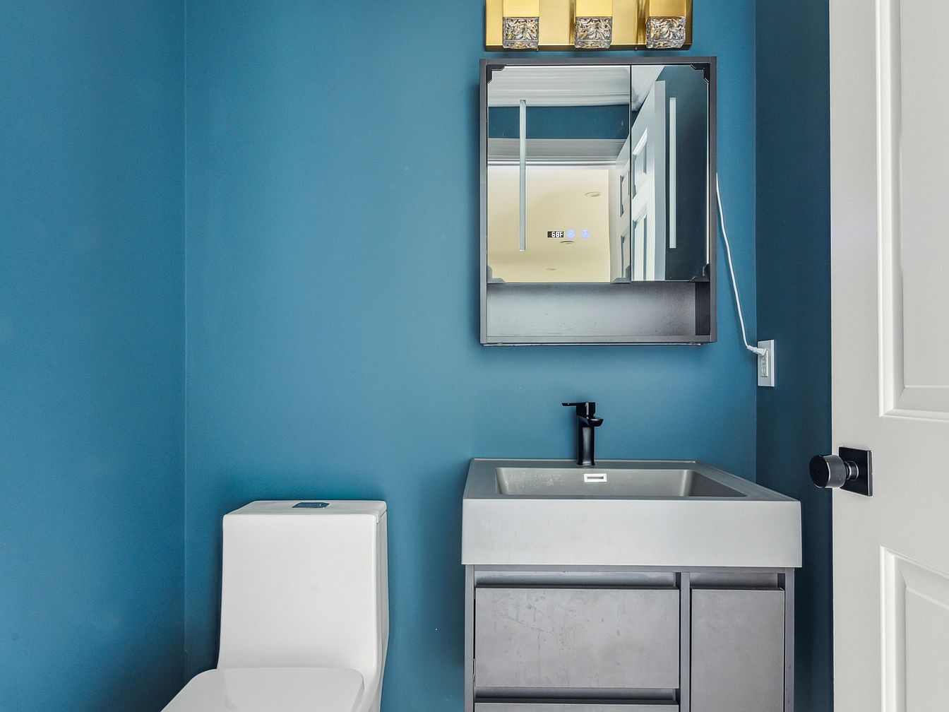 This bathroom features a contemporary design with a striking deep blue wall color, creating a soothing atmosphere. To the left, a sleek white toilet seamlessly blends into the minimalistic aesthetic. The focus is on a modern, square sink with a smooth gray countertop that complements the cabinetry. Below, the cabinets are finished in a simple gray metal material, providing storage while maintaining the streamlined look. Above the sink, a stylish mirror adds depth, reflecting light from suspended fixtures. The room is punctuated by a clean white door, enhancing the brightness and contrast against the dark walls.