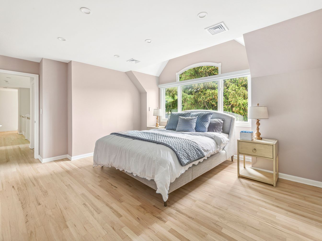 A serene bedroom featuring soft pink walls paired with light hardwood flooring, creating an inviting atmosphere. The bed, adorned with a white duvet and navy quilt, is centered beneath a large arched window that offers a lush view of greenery. Numerous plush pillows in varying shades of blue enhance the bed’s appeal. A gold bedside table supports a simple lamp, adding a touch of elegance. The sloped ceiling adds architectural interest, complemented by recessed lighting that brightens the room. A glimpse of a hallway can be seen in the background, suggesting a spacious layout.