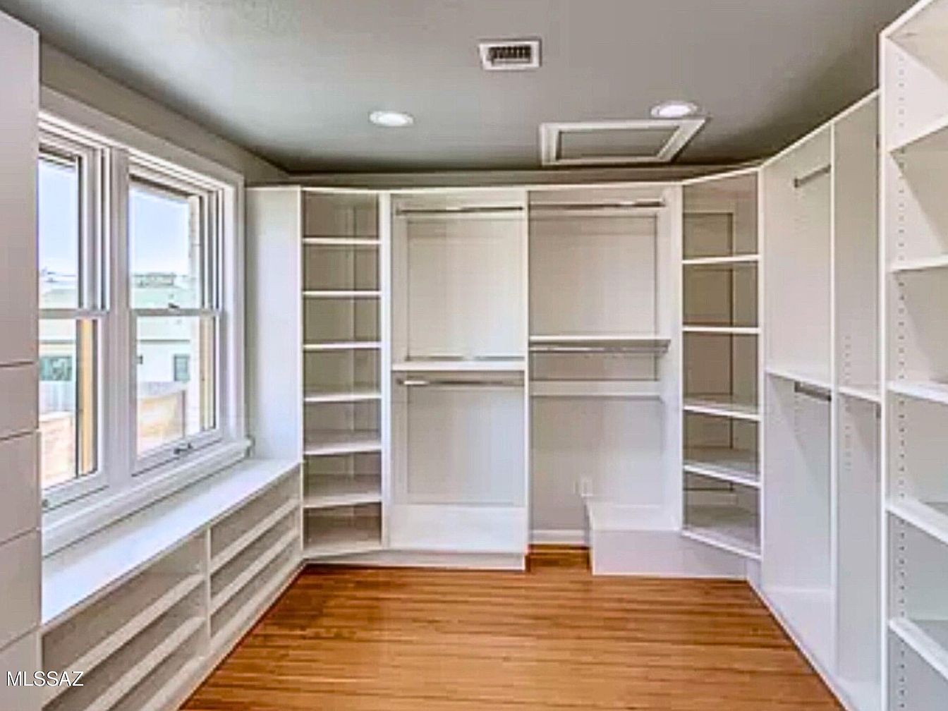 Bright, spacious walk-in closet featuring walls of custom built-in white cabinetry along three sides, with a mix of open shelving, hanging rods, and cubby spaces for organized storage. Natural light floods in from a set of large double-hung windows, which are positioned above additional low shelving perfect for shoes or bins. The warm, honey-toned hardwood flooring adds a touch of classic elegance and contrasts subtly with the fresh white cabinetry. Recessed ceiling lights and a vent provide illumination and airflow, while clean lines and efficient layout offer a functional, minimalist aesthetic.