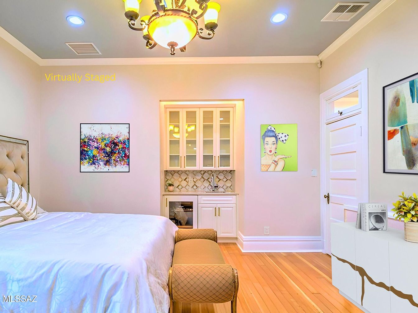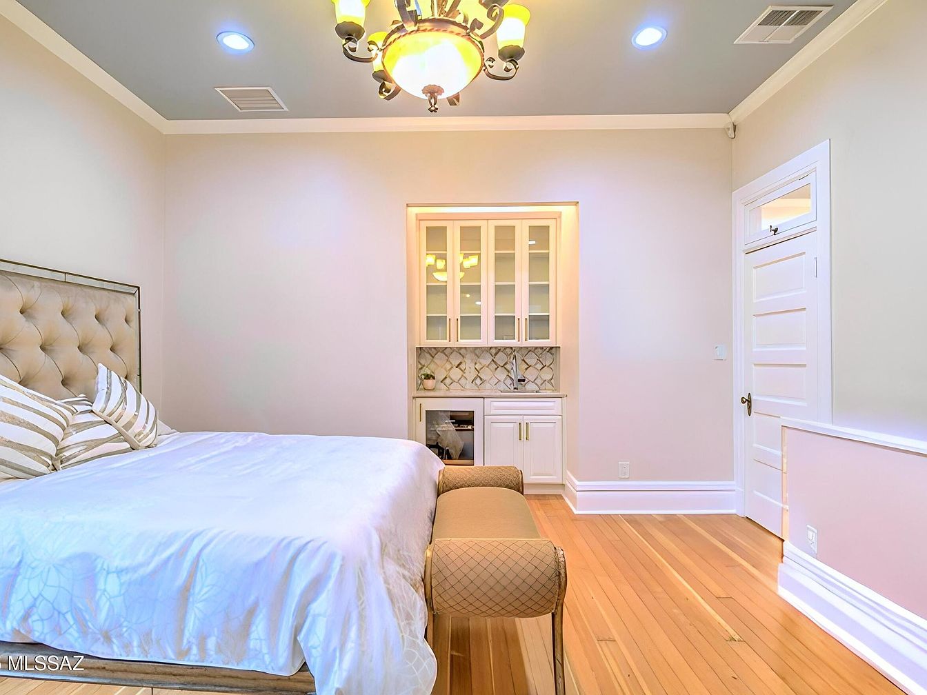 A spacious bedroom featuring a large, tufted headboard upholstered in neutral tones, positioned to the left with plush pillows arranged neatly. The bedding is white with a subtle sheen, complemented by a cushioned bench at the bed’s foot upholstered in a tan geometric fabric. The flooring is natural hardwood with a warm tone. Along the far wall is a built-in cabinet with glass doors and a marble-like backsplash, topped with sleek brass hardware, perfect for display or storage. The walls are soft beige with white trim, contrasted by a cool gray ceiling and elegant crown molding. Overhead, a modern chandelier emits a golden glow, and recessed lighting adds brightness.