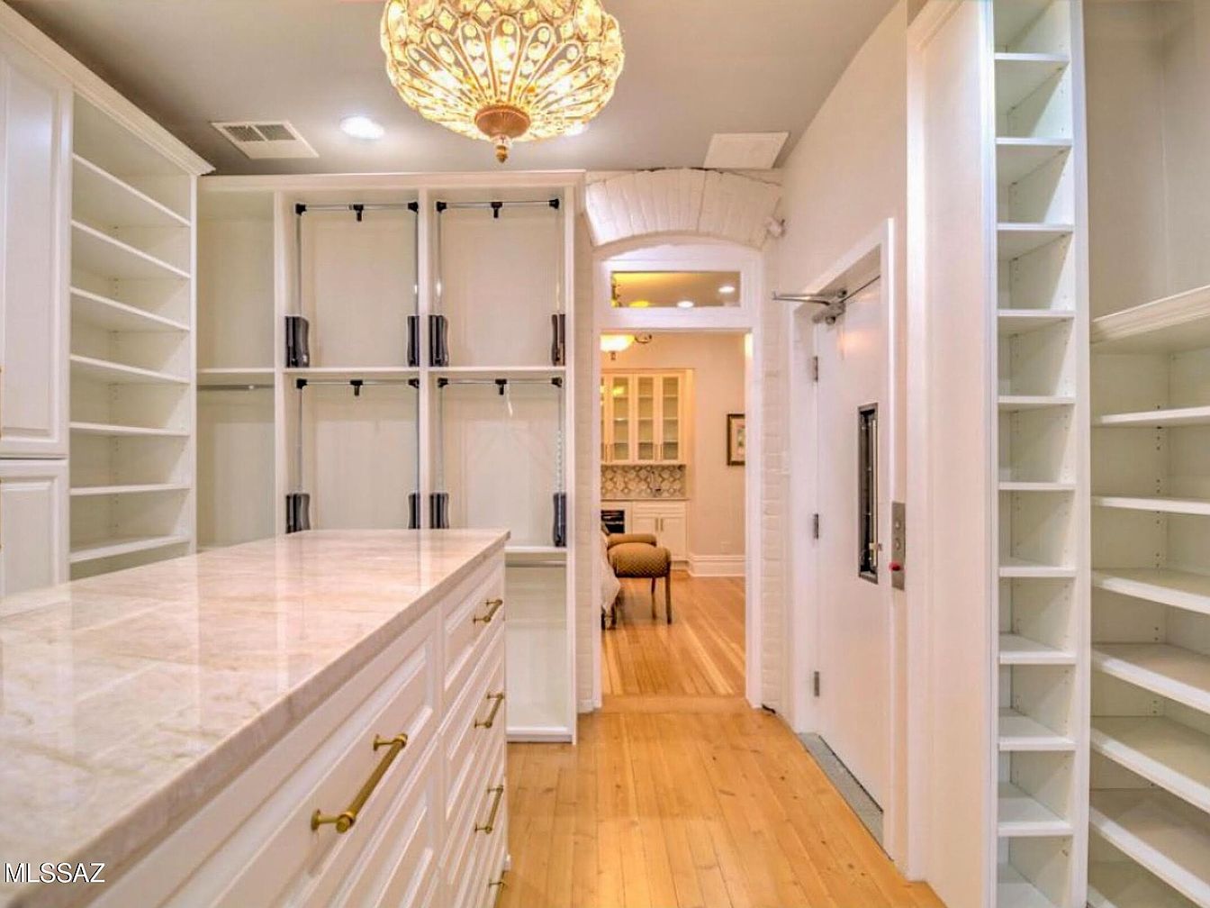 Spacious walk-in closet with custom built-in shelving and hanging sections lining both walls, offering abundant storage for clothes, shoes, and accessories. A marble-topped island with multiple drawers and gold hardware stands at the center, providing both storage and surface space. The warm wooden floors contrast with the crisp white cabinetry. A statement overhead light fixture with a vintage-inspired, intricate glass design adds an elegant focal point and soft illumination. Through a rounded brick archway, another room with more cabinetry and an upholstered bench is visible, reinforcing the luxurious and organized atmosphere of this dressing area.