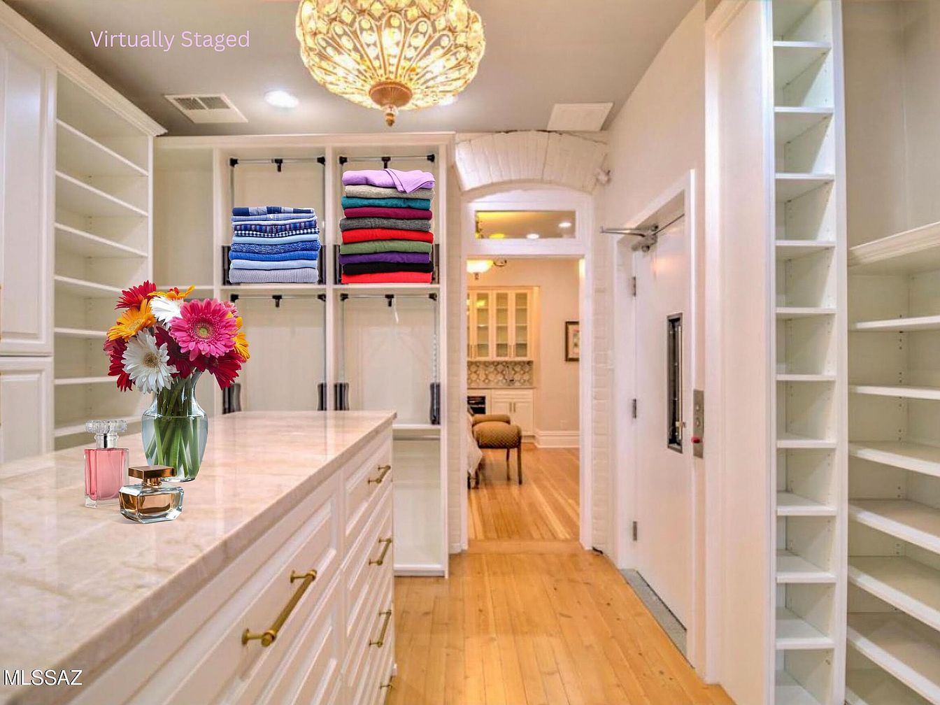 Spacious walk-in closet featuring floor-to-ceiling white built-in shelving on both sides, providing ample storage space. A central island with sleek white cabinetry and brass handles sits in the middle, topped with a light marble countertop. The surface is adorned with a vase of bright, fresh flowers and a few elegant perfume bottles, adding a touch of sophistication. Overhead, a large statement chandelier with a warm glow illuminates the space. The wood floor is a natural, pale color, creating a bright and inviting atmosphere. An arched entryway and glimpses of a seating area enhance the luxurious, organized feel.