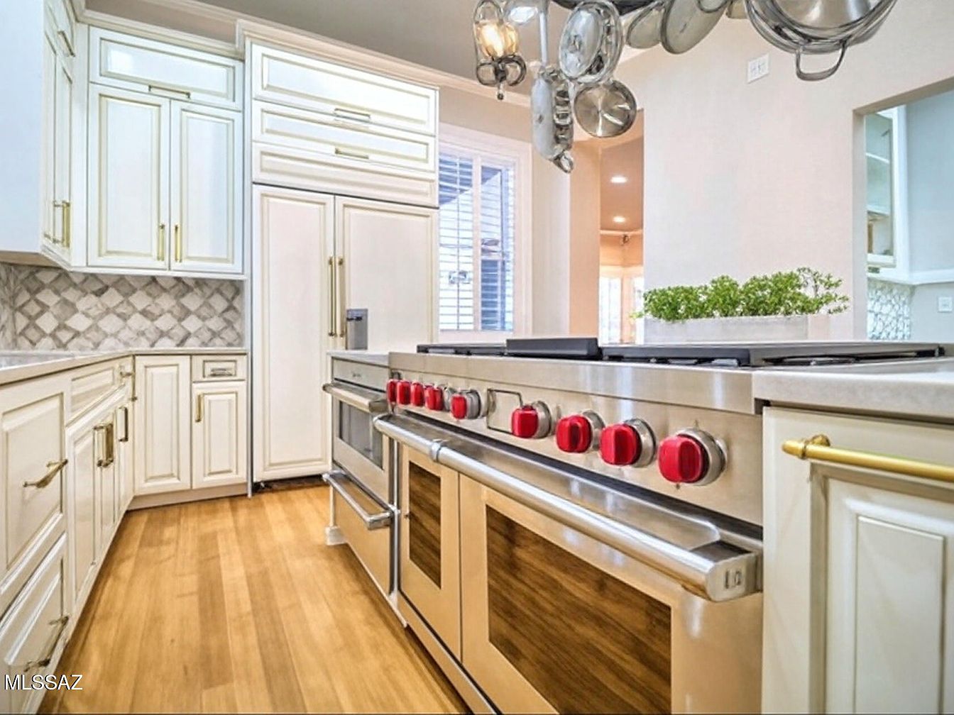 Spacious kitchen featuring a professional-grade stainless steel gas stove accented with vivid red knobs and a matching oven door with a wooden inlay. Cream-colored cabinetry with gold hardware lines the left and back walls, complemented by a geometric patterned tile backsplash in grey and white tones. A sleek paneled refrigerator blends seamlessly with the cabinetry. The natural wood flooring adds warmth, and a large window fills the area with natural light. Overhead, pots and pans hang from a rack above the stove. Brass-toned handles and soft beige walls offer a classic, elegant touch to the space.