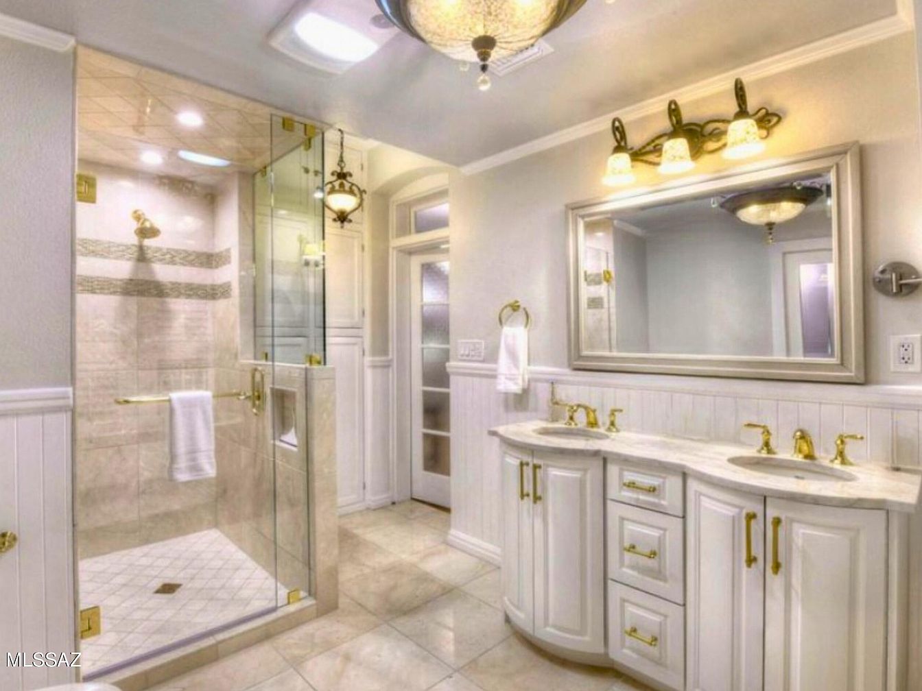 Spacious bathroom with a double vanity featuring curved white cabinetry, marble countertops, and brass hardware. The vanity is set beneath a large, rectangular mirror framed in silver, with three elegant wall sconces above. The walk-in shower has frameless glass doors, brass fixtures, and decorative tile bands. Creamy floor tiles extend throughout the room, complementing the pale neutral palette of the walls. Wainscoting wraps the lower half of the room for a touch of classic detail. Recessed and pendant lighting create a warm, inviting atmosphere, highlighting the luxurious and historic feel of the space.