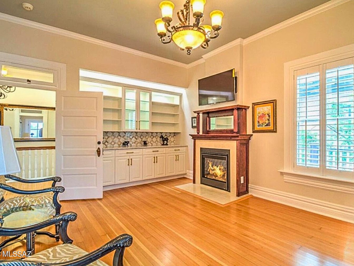 Warm wooden floors stretch across the small living room, complemented by light cream walls and white trim. A gas fireplace with a polished wooden mantel anchors one side, topped by a wall-mounted television. To the left, built-in cabinetry features glass-doored shelves and a diamond-patterned tile backsplash, introducing visual interest. Large plantation-style shuttered windows fill the room with natural light, while classic armchairs with ornate wooden frames and patterned upholstery add elegance and comfort. A vintage-style chandelier hangs from the ceiling, casting a soft golden glow and enhancing the historical character of the space.