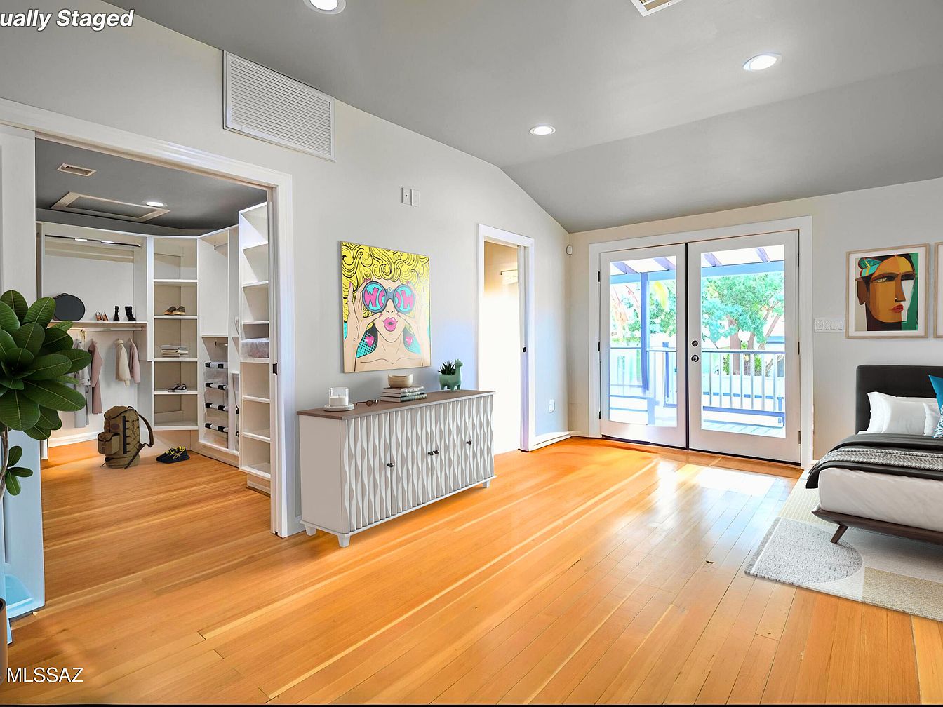 Spacious bedroom featuring warm honey-toned hardwood flooring and neutral, light-gray walls paired with a vaulted ceiling for an open feel. The room connects to an organized walk-in closet with built-in shelves, hanging rods, and cubbies designed for optimal storage. Modern pop-art paintings infuse color and personality above a sculptural white sideboard. A plush, low-profile bed with gray upholstery sits partially visible on a textured area rug. French doors framed in white trim open to an airy balcony, inviting natural light and outdoor views. Recessed ceiling lights and minimalistic décor emphasize a clean, contemporary yet inviting aesthetic.