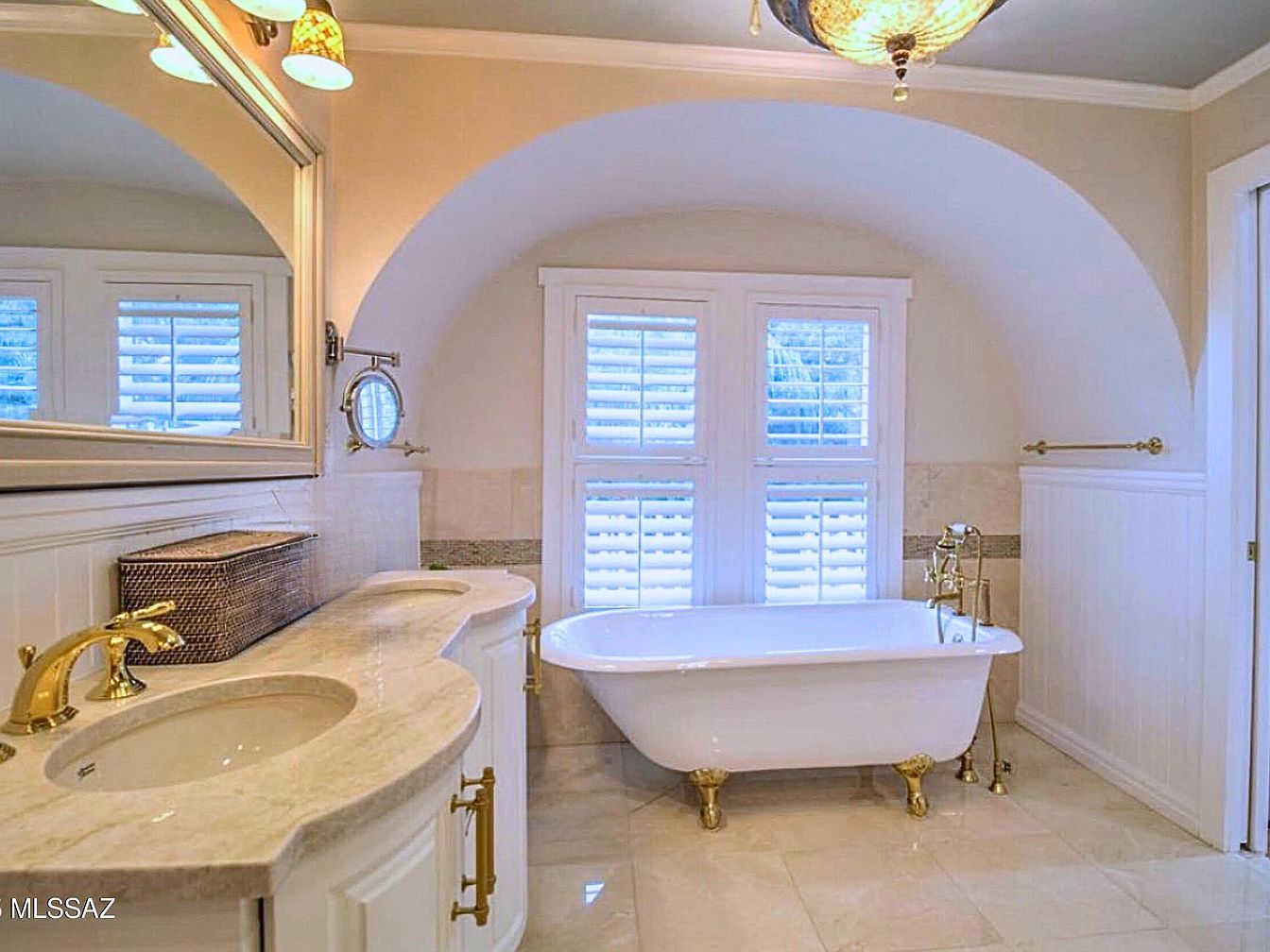 A luxurious bathroom featuring a freestanding white clawfoot bathtub with gold feet, positioned beneath a large arched alcove and in front of two shuttered windows. The double-sink vanity has a curved marble countertop and matching gold fixtures, complemented by a large framed mirror. The walls are painted a soft beige, blending with white wainscoting and marble flooring. Warm gold accents, including the faucets, cabinet handles, and towel racks, create a classic, elegant ambiance. A vintage-style light fixture with a golden glow hangs from the ceiling, reinforcing the warm, inviting atmosphere of this historic space.