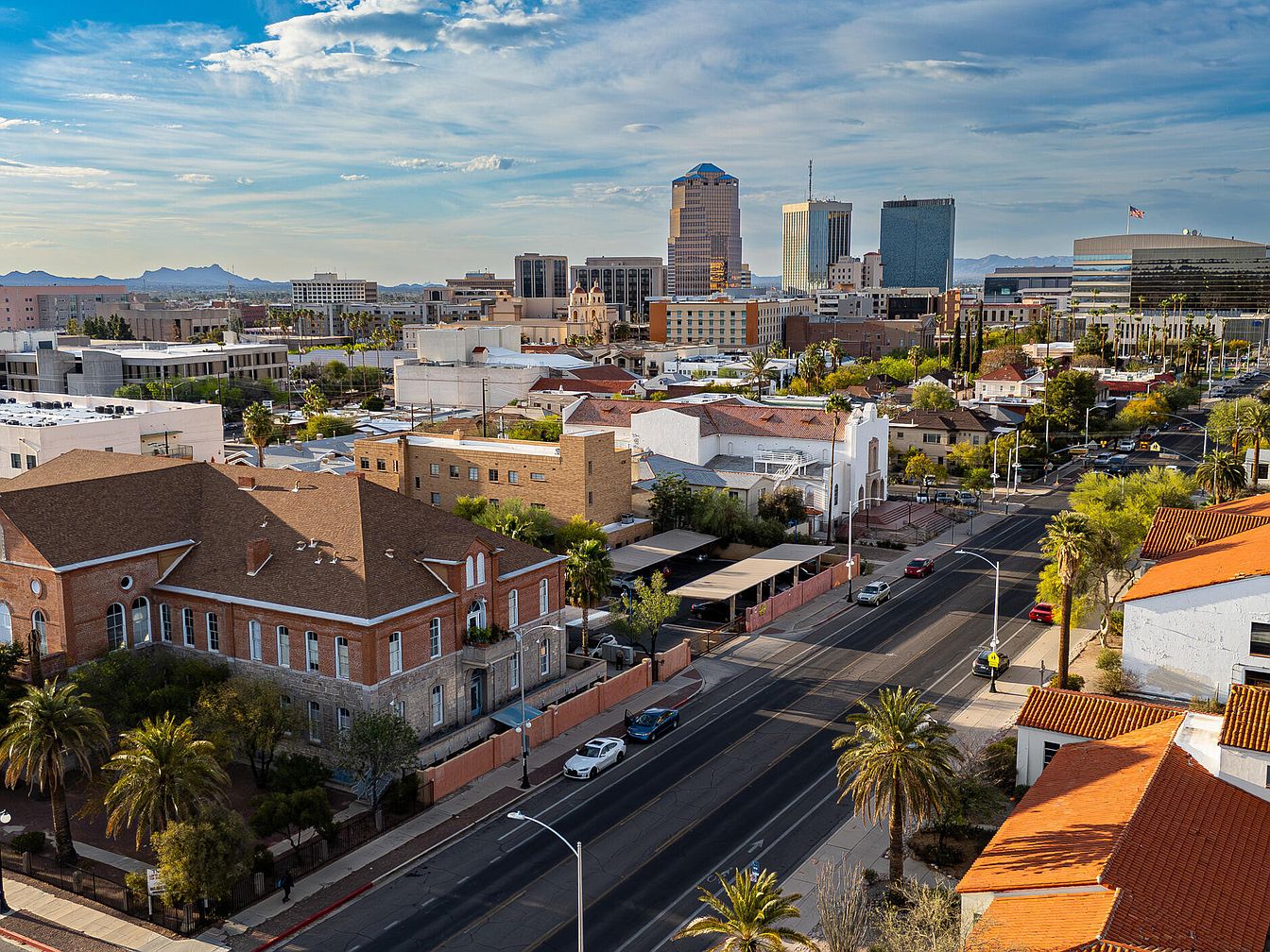 Aerial view of a city neighborhood displaying a blend of historic and modern architecture. Foreground features a large brick-and-stone building with arched windows and a brown shingled roof, surrounded by mature palm trees and greenery. Across the street, more historic buildings in white and tan hues line the road, which is bordered by sidewalks and marked by the presence of parked and moving cars. In the distance, a downtown skyline rises with tall modern office towers, and mountains stretch along the horizon under a blue sky with scattered clouds, contributing to a vibrant and dynamic urban landscape.