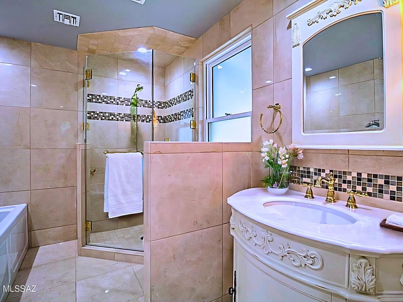 Elegant bathroom featuring a white carved vanity with ornate details, topped with a glossy white countertop and an under-mount sink. Brass fixtures and a round towel ring add vintage charm. Above the vanity, a large framed mirror with decorative molding hangs, surrounded by beige marble tile walls. A mosaic tile accent strip in neutral tones runs along both the vanity backsplash and shower. The walk-in shower has glass enclosures with brass hardware, a towel bar, and a fresh flower in a vase for a touch of nature. Recessed lighting and a window brighten the serene, polished space with soft, warm hues.