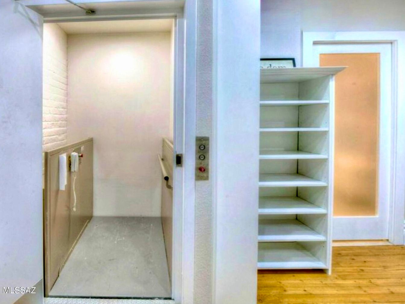 This area features a small residential elevator tucked into a hallway, identifiable by the simple control panel and handrails inside the elevator, with a brick accent wall on one side. Adjacent to the elevator, built-in white shelves provide open storage, blending seamlessly with the crisp white walls. The hallway floor is finished in natural-hued wood planks for a warm, inviting contrast to the white elements. A frosted glass-paneled door adds privacy while letting in soft, diffused light. Overall, the design style feels clean, practical, and subtly modern, with an emphasis on functionality and accessibility.
