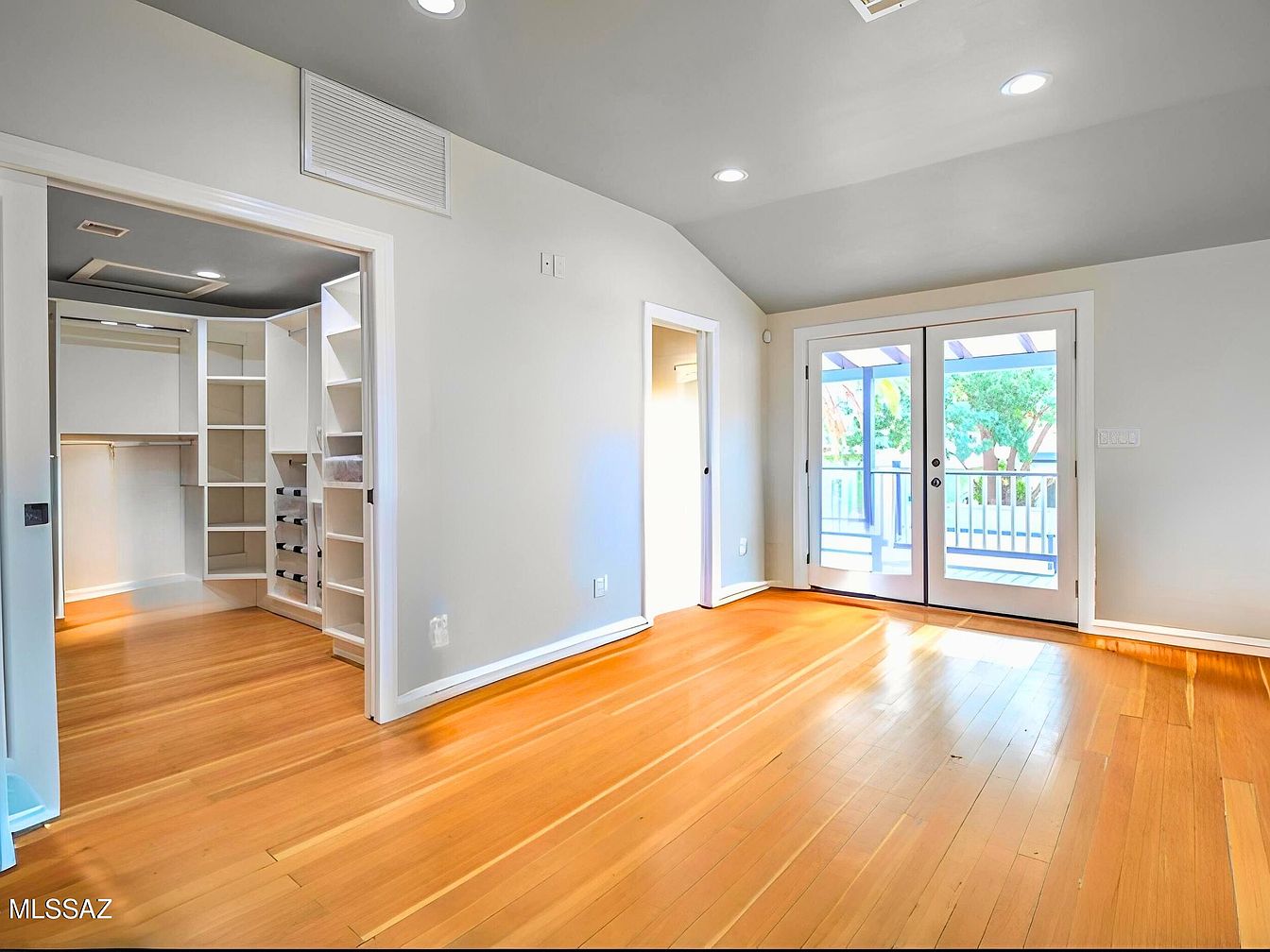 Spacious bedroom featuring warm honey-colored hardwood floors and walls painted in soft, neutral tones. Double glass French doors provide ample sunlight and lead to a covered outdoor deck. The ceiling is angled, painted light gray, with recessed ceiling lights providing illumination. On one side, a wide entryway opens into a large walk-in closet, which has custom shelving, ample hanging space, and built-in shoe racks. The room’s minimalist aesthetic is enhanced by clean lines, an uncluttered layout, and generous natural light, creating an inviting, airy, and modern feel while preserving classic charm with wooden accents and trim.