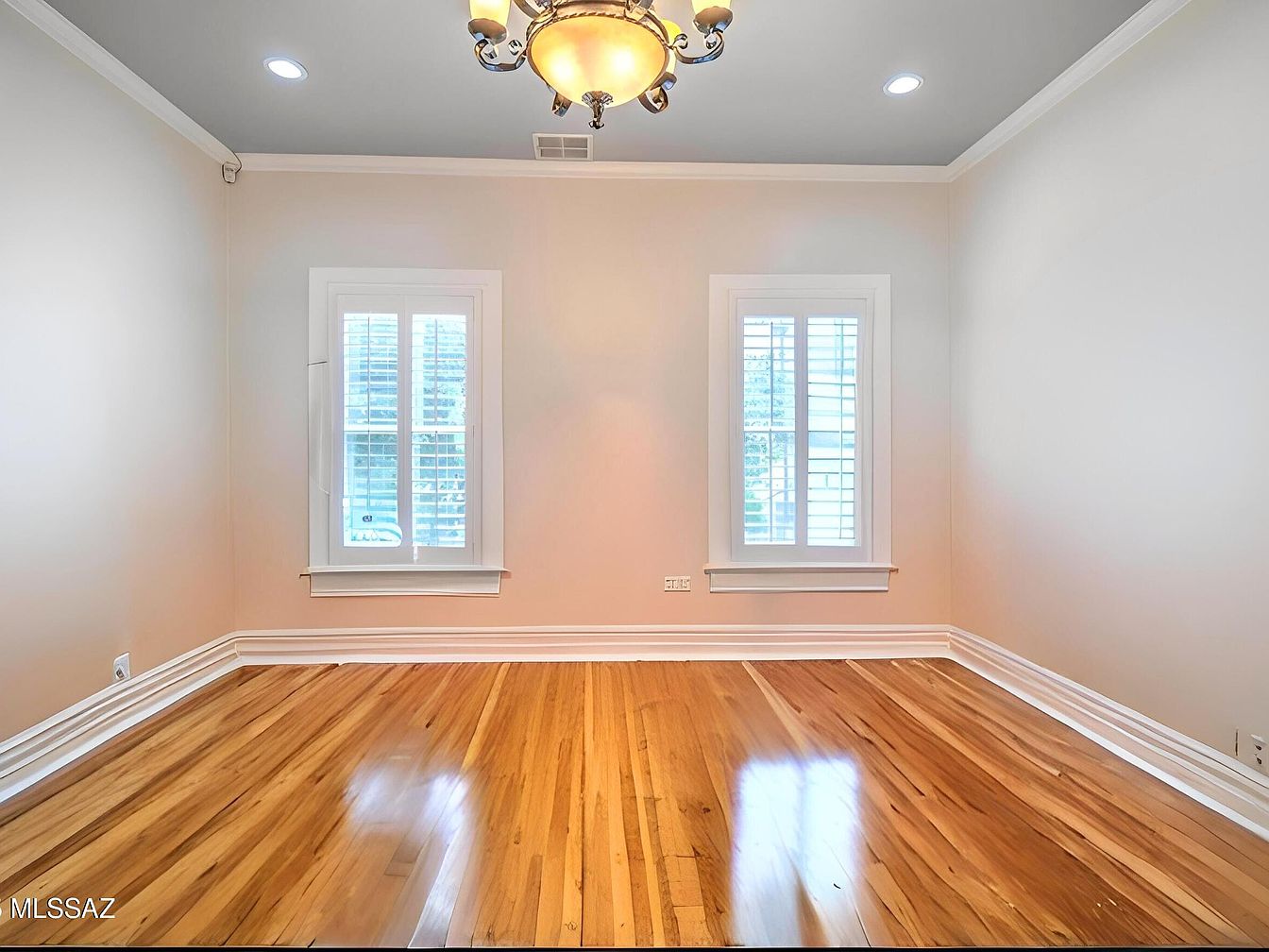 A small, bright room featuring light beige walls and a sleek, medium-gray ceiling adorned with crisp white crown molding. Two tall, narrow windows with white plantation shutters allow ample natural light to filter in. The gleaming hardwood floors showcase a warm honey-toned finish and run diagonally, adding visual interest. The baseboards are also painted white and are notably tall, emphasizing the home’s historic character. Overhead, an ornate brass and frosted glass chandelier sits in the center, complemented by modern recessed lighting. The room is empty, highlighting the clean lines and simplicity of the architectural details.