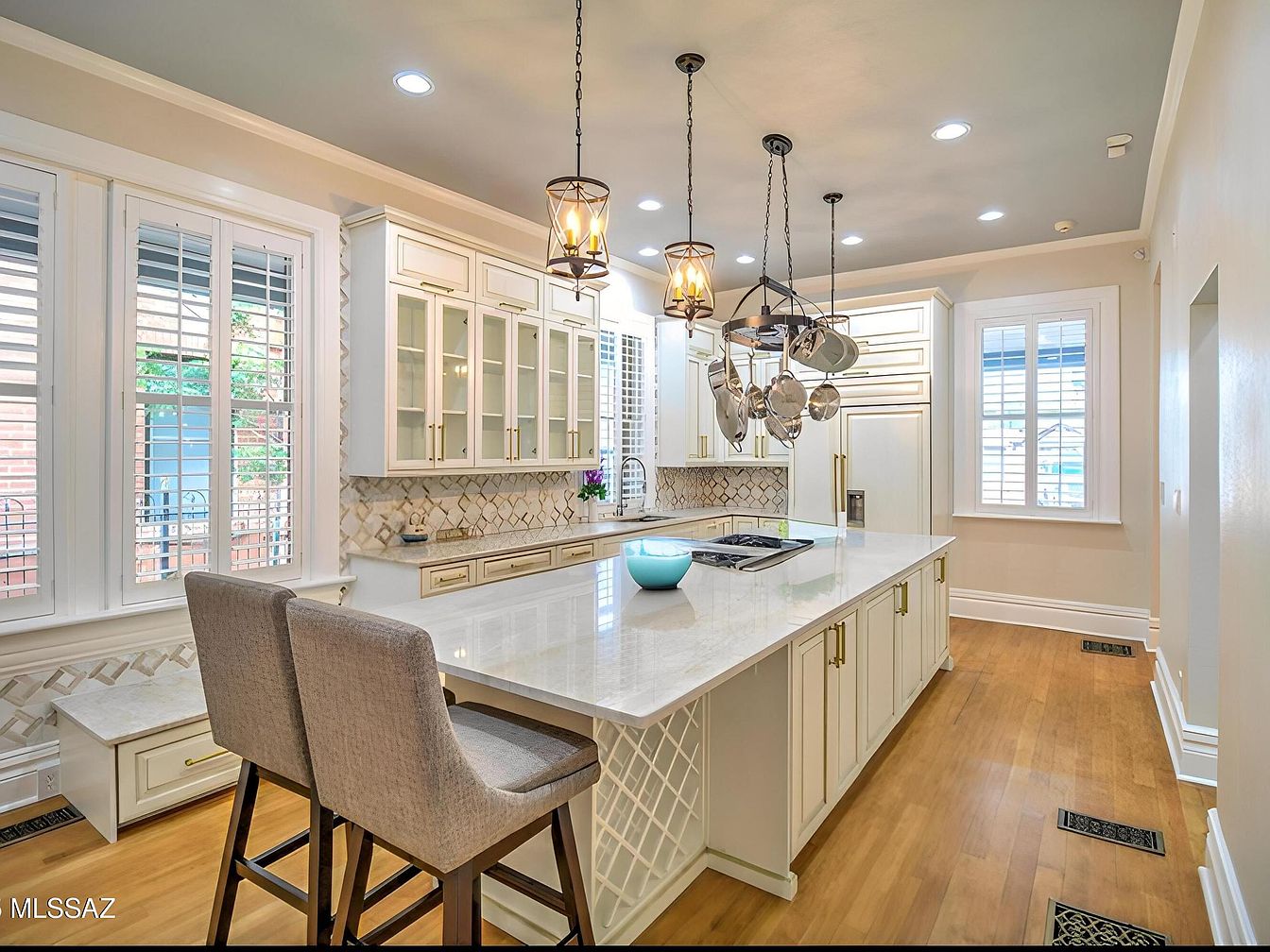 A spacious kitchen is arranged with a prominent island in the center, topped with polished white marble and equipped with a built-in cooktop and sink. Two upholstered bar stools with wooden legs are positioned at the end of the island, providing seating. Overhead, ornate pendant lights and a black wrought-iron pot rack display hanging cookware. The cabinetry is cream-colored with gold hardware and glass fronts, complemented by a subtle geometric tile backsplash. Wide windows with plantation shutters allow abundant natural light, and the floors are a warm, honey-toned wood. Decorative soffit molding and soft neutral wall colors complete the elegant, airy look.