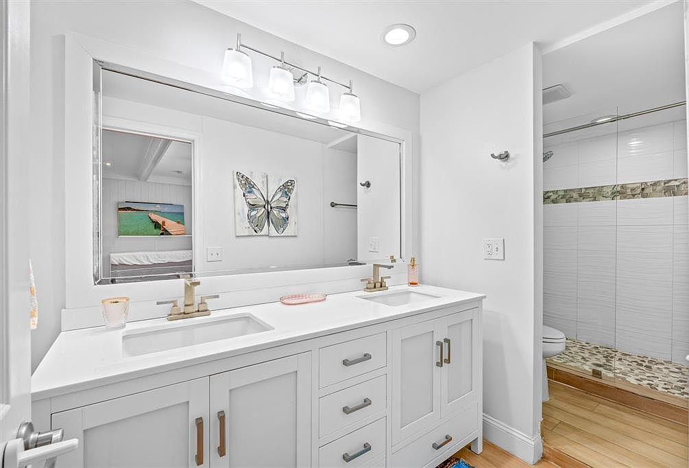 A bright and modern bathroom with a double-sink white vanity sits under a large, framed mirror. The vanity features brushed brass fixtures, sleek cabinet handles, and two undermount sinks. Overhead, a row of four frosted glass lights provides even illumination. The color palette is crisp with white walls and cabinetry, paired with light wood flooring that adds warmth. A large walk-in shower with glass doors showcases a strip of decorative stone tile halfway up the wall. Artwork, such as a large butterfly print, and a hint of another room are visible in the mirror, adding an inviting touch.