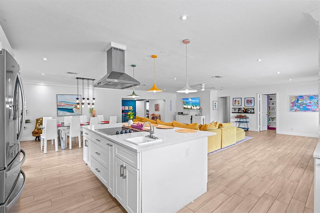 Spacious open plan integrates kitchen, dining, and living areas with light wood flooring and crisp white walls. The kitchen features a large white island with stovetop and sink, stainless steel refrigerator, and modern pendant lights in orange, green, and white for accents. Dining area includes a sleek table with white chairs and colorful artwork. The living space centers on a plush yellow sectional couch facing a wall-mounted TV. Additional touches include bright throw pillows, eclectic wall art, and mid-century modern décor, giving the space a lively, inviting, and airy aesthetic with pops of color throughout.