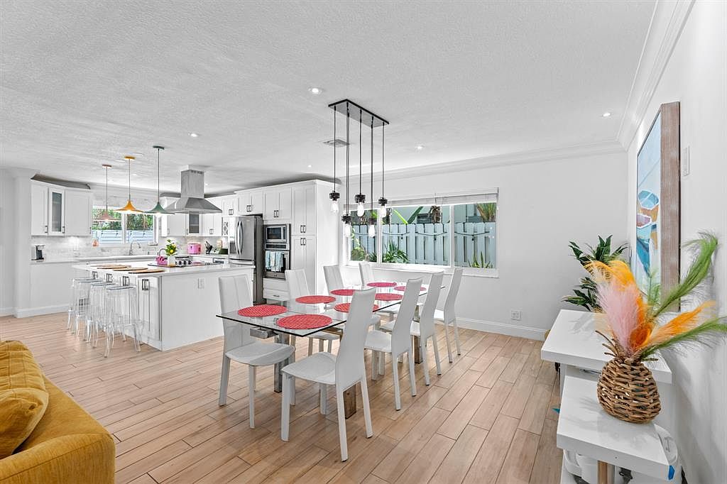 A spacious, open-plan dining and kitchen area is showcased with a contemporary, bright atmosphere. Light wooden floors run throughout, providing warmth against the crisp white walls and cabinetry. The dining section features a glass table set for eight with modern white chairs and coral-colored placemats. Elegant, minimalist pendant lights hang over both the table and the kitchen island, adding artistic flair. The kitchen is equipped with stainless steel appliances, a large island with clear acrylic stools, and sleek cabinetry with black hardware. Large windows flood the space with natural light, while greenery and a colorful painting add touches of vibrancy and personality.