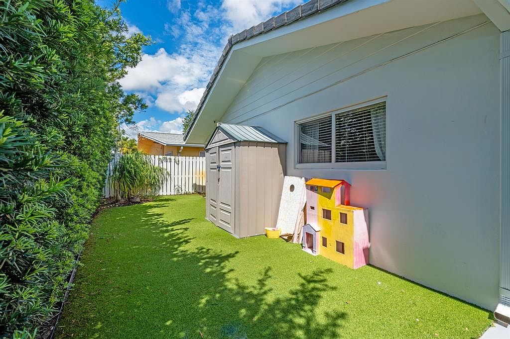 This narrow outdoor space runs along the side of the house, featuring a lush artificial grass lawn bordered by tall, dense greenery on one side and the white exterior wall on the other. A window with horizontal blinds provides a view from inside, while a compact beige storage shed stands against the house. Vibrant children’s playhouses in bright yellow and pink lean against the wall, adding a playful and welcoming touch. The atmosphere feels bright and open with blue skies above and sunlight streaming into the tidy, private yard, suggesting a safe play or relaxation zone for families.